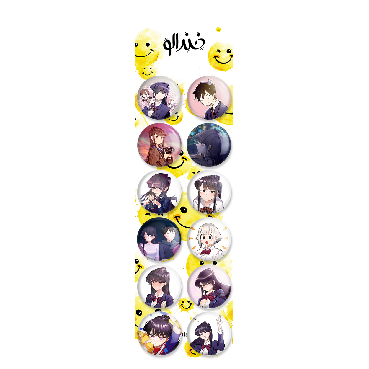 پک 12 عددی پیکسل خندالو طرح انیمه کومی سان با روکش سلفون حرارتی براق ضدخش و قطعه پشتی رنگی تولید شده است. قطعات پشتی از میان 6 رنگ سفید، مشکی، صورتی، زرد، آبی و قرمز که با توجه به نوع و رنگبندی طرح روی پیکسل انتخاب شده اند تولید می شود و در هر بسته بندی مطابق عکس محصول می باشد. قطعات پلاستیکی پشت پیکسل با سوزن یک تکه ثابت و بدون لغزش و جا به جایی، ایستایی بسیار بهتری نسبت به پشتی فلزی پیکسل دارند که این مهم در تولید این محصول نیز رعایت شده است.