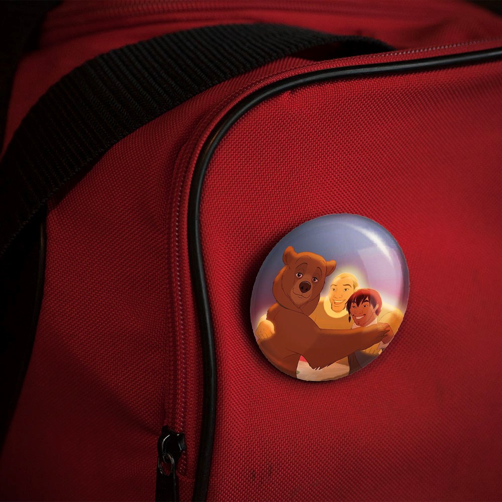 پیکسل 44 میلی متری انیمیشن خرس برادر Brother Bear خندالو با روکش سلفون حرارتی مات مخملی ضدخش و قطعه پشتی رنگی تولید شده است.پلاستیکی پشت پیکسل با سوزن یک تکه ثابت و بدون لغزش و جا به جایی، ایستایی بسیار بهتری نسبت به پشتی فلزی پیکسل دارند که این مهم در تولید این محصول نیز رعایت شده است.