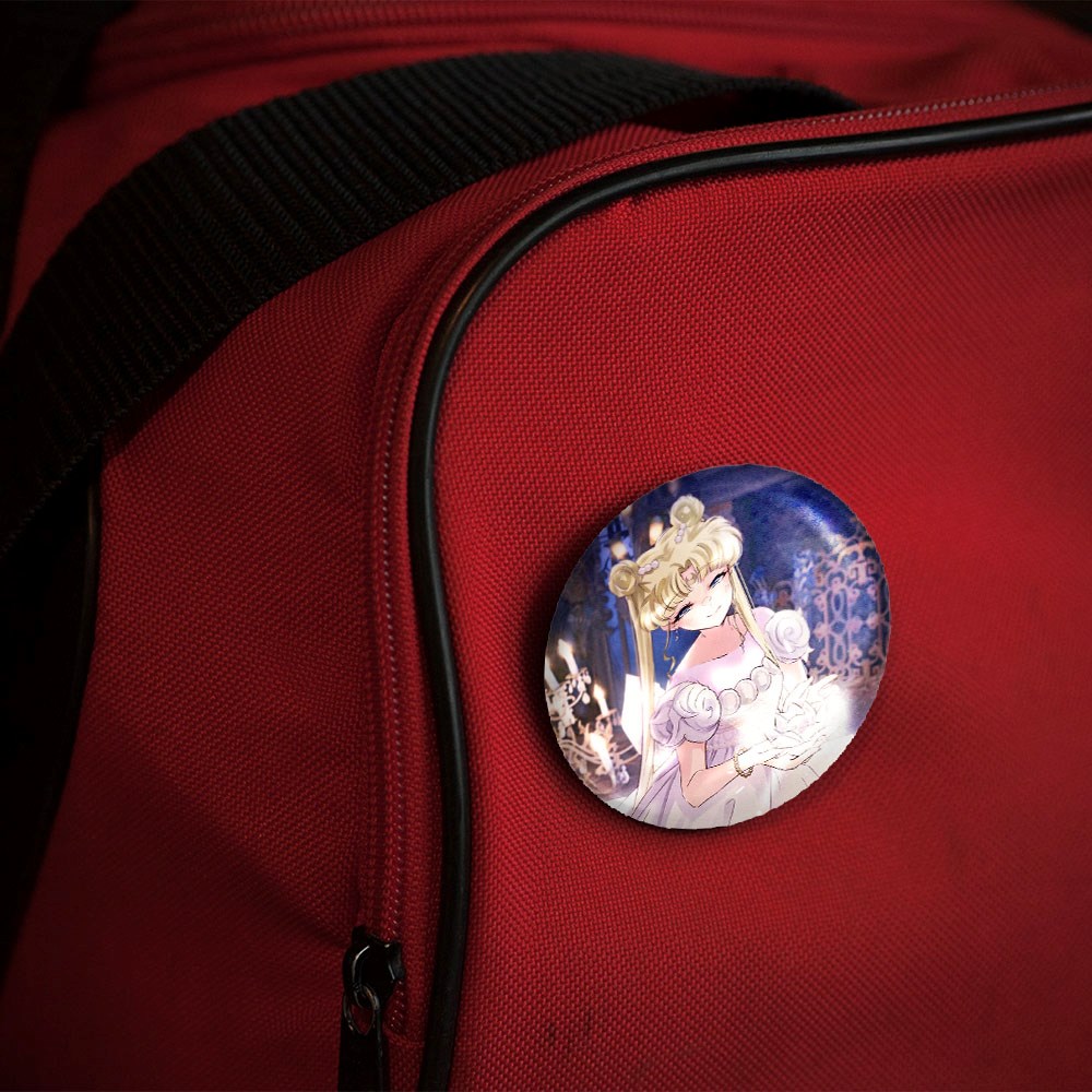 پیکسل 44 میلی متری اوساگی تسوکینو انیمه سیلور مون Sailor Moon خندالو با روکش سلفون حرارتی مات مخملی ضدخش و قطعه پشتی رنگی تولید شده است.پلاستیکی پشت پیکسل با سوزن یک تکه ثابت و بدون لغزش و جا به جایی، ایستایی بسیار بهتری نسبت به پشتی فلزی پیکسل دارند که این مهم در تولید این محصول نیز رعایت شده است.