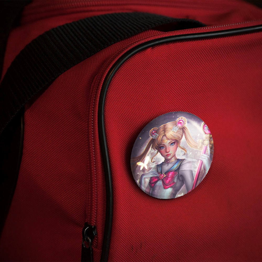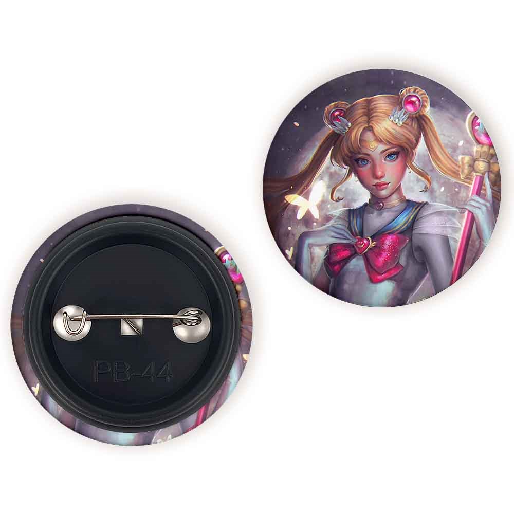 پیکسل 44 میلی متری اوساگی تسوکینو انیمه سیلور مون Sailor Moon خندالو با روکش سلفون حرارتی مات مخملی ضدخش و قطعه پشتی رنگی تولید شده است.پلاستیکی پشت پیکسل با سوزن یک تکه ثابت و بدون لغزش و جا به جایی، ایستایی بسیار بهتری نسبت به پشتی فلزی پیکسل دارند که این مهم در تولید این محصول نیز رعایت شده است.