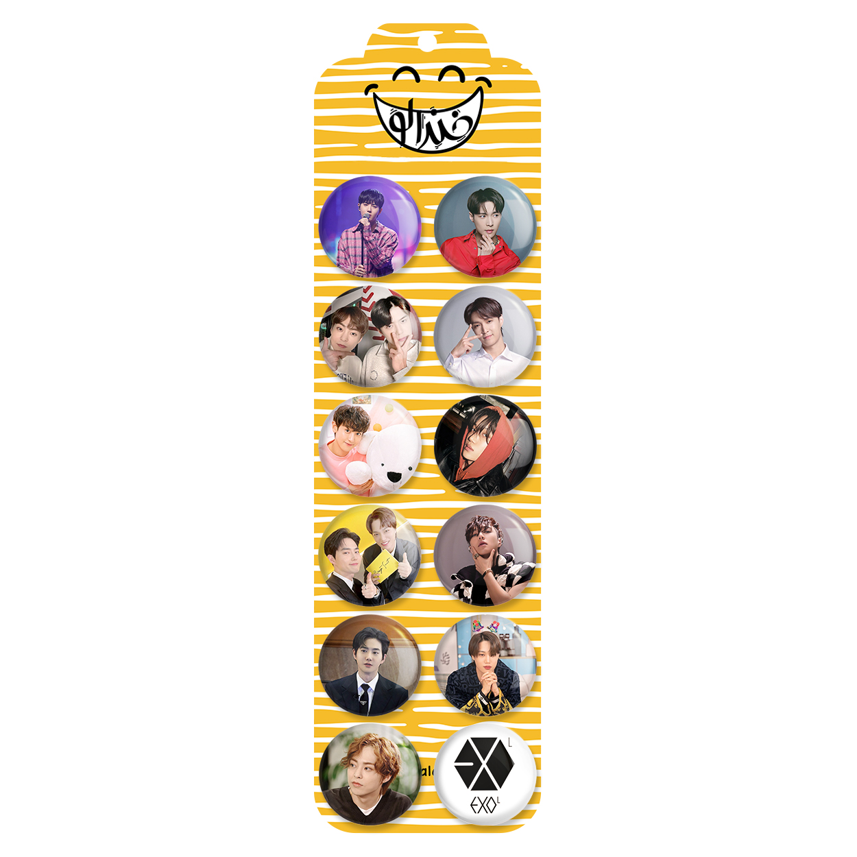 پک 12 عددی پیکسل خندالو طرح اکسو EXO با روکش سلفون حرارتی براق ضدخش و قطعه پشتی رنگی تولید شده است. قطعات پشتی از میان 6 رنگ سفید، مشکی، صورتی، زرد، آبی و قرمز که با توجه به نوع و رنگبندی طرح روی پیکسل انتخاب شده اند تولید می شود و در هر بسته بندی مطابق عکس محصول می باشد. قطعات پلاستیکی پشت پیکسل با سوزن یک تکه ثابت و بدون لغزش و جا به جایی، ایستایی بسیار بهتری نسبت به پشتی فلزی پیکسل دارند که این مهم در تولید این محصول نیز رعایت شده است. چاپ پیکسل طرح اکسو EXO بسته ۱۲ عددی نیز با دستگاه های استاندارد و با بهترین سطح کیفی صورت گرفته و طرح با شفافیتی مثال زدنی و با سلفونی بدون شکست نور بر روی پیکسل نقش بسته است.