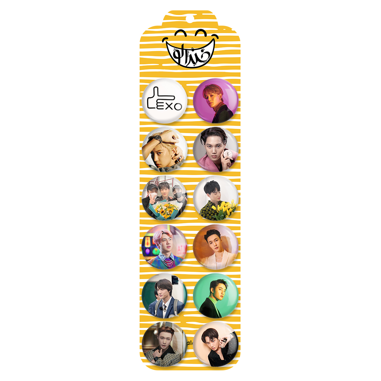 پک 12 عددی پیکسل خندالو طرح اکسو EXO با روکش سلفون حرارتی براق ضدخش و قطعه پشتی رنگی تولید شده است. قطعات پشتی از میان 6 رنگ سفید، مشکی، صورتی، زرد، آبی و قرمز که با توجه به نوع و رنگبندی طرح روی پیکسل انتخاب شده اند تولید می شود و در هر بسته بندی مطابق عکس محصول می باشد. قطعات پلاستیکی پشت پیکسل با سوزن یک تکه ثابت و بدون لغزش و جا به جایی، ایستایی بسیار بهتری نسبت به پشتی فلزی پیکسل دارند که این مهم در تولید این محصول نیز رعایت شده است.
