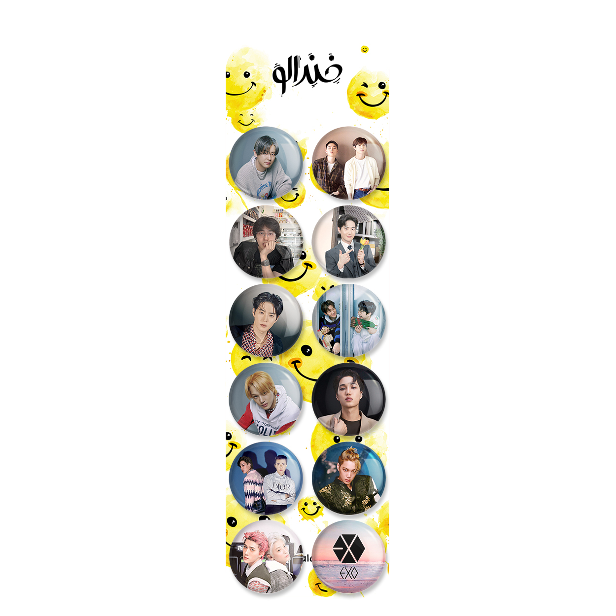 پک 12 عددی پیکسل خندالو طرح اکسو EXO با روکش سلفون حرارتی براق ضدخش و قطعه پشتی رنگی تولید شده است. قطعات پشتی از میان 6 رنگ سفید، مشکی، صورتی، زرد، آبی و قرمز که با توجه به نوع و رنگبندی طرح روی پیکسل انتخاب شده اند تولید می شود و در هر بسته بندی مطابق عکس محصول می باشد. قطعات پلاستیکی پشت پیکسل با سوزن یک تکه ثابت و بدون لغزش و جا به جایی، ایستایی بسیار بهتری نسبت به پشتی فلزی پیکسل دارند که این مهم در تولید این محصول نیز رعایت شده است.