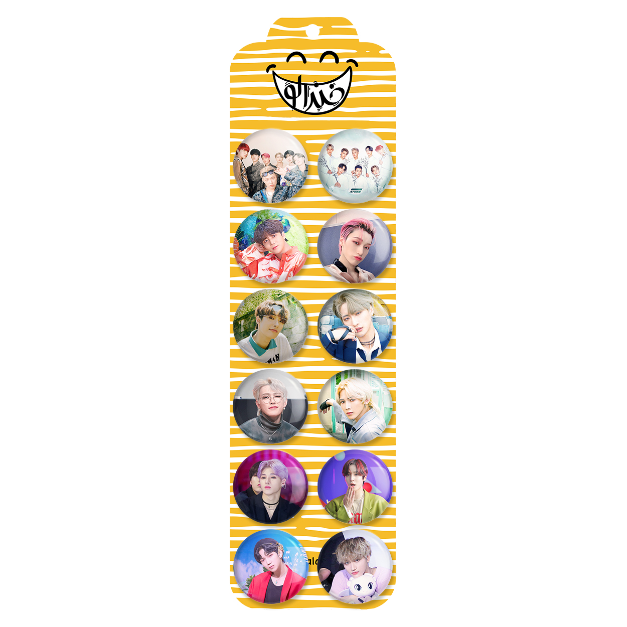 پک 12 عددی پیکسل خندالو طرح ایتیز (Ateez) با روکش سلفون حرارتی براق ضدخش و قطعه پشتی رنگی تولید شده است. قطعات پشتی از میان 6 رنگ سفید، مشکی، صورتی، زرد، آبی و قرمز که با توجه به نوع و رنگبندی طرح روی پیکسل انتخاب شده اند تولید می شود و در هر بسته بندی مطابق عکس محصول می باشد. قطعات پلاستیکی پشت پیکسل با سوزن یک تکه ثابت و بدون لغزش و جا به جایی، ایستایی بسیار بهتری نسبت به پشتی فلزی پیکسل دارند که این مهم در تولید این محصول نیز رعایت شده است. چاپ پیکسل طرح ایتیز (Ateez) بسته ۱۲ عددی نیز با دستگاه های استاندارد و با بهترین سطح کیفی صورت گرفته و طرح با شفافیتی مثال زدنی و با سلفونی بدون شکست نور بر روی پیکسل نقش بسته است.
