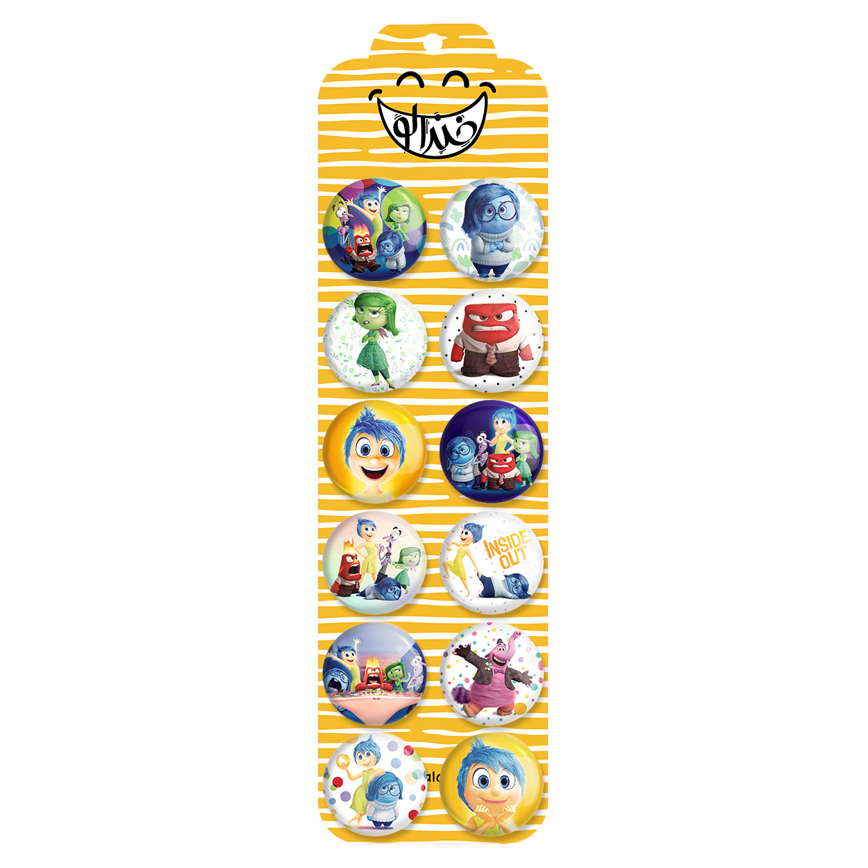 پک 12 عددی پیکسل خندالو طرح اینساید اوت (Inside Out) با روکش سلفون حرارتی براق ضدخش و قطعه پشتی رنگی تولید شده است. قطعات پشتی از میان 6 رنگ سفید، مشکی، صورتی، زرد، آبی و قرمز که با توجه به نوع و رنگبندی طرح روی پیکسل انتخاب شده اند تولید می شود و در هر بسته بندی مطابق عکس محصول می باشد. قطعات پلاستیکی پشت پیکسل با سوزن یک تکه ثابت و بدون لغزش و جا به جایی، ایستایی بسیار بهتری نسبت به پشتی فلزی پیکسل دارند که این مهم در تولید این محصول نیز رعایت شده است. چاپ پیکسل طرح اینساید اوت (Inside Out) بسته ۱۲ عددی نیز با دستگاه های استاندارد و با بهترین سطح کیفی صورت گرفته و طرح با شفافیتی مثال زدنی و با سلفونی بدون شکست نور بر روی پیکسل نقش بسته است.