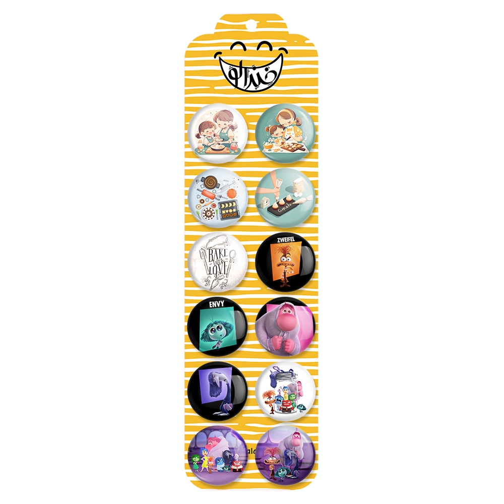 پک 12 عددی پیکسل خندالو طرح اینساید اوت (Inside Out) با روکش سلفون حرارتی براق ضدخش و قطعه پشتی رنگی تولید شده است. قطعات پشتی از میان 6 رنگ سفید، مشکی، صورتی، زرد، آبی و قرمز که با توجه به نوع و رنگبندی طرح روی پیکسل انتخاب شده اند تولید می شود و در هر بسته بندی مطابق عکس محصول می باشد. قطعات پلاستیکی پشت پیکسل با سوزن یک تکه ثابت و بدون لغزش و جا به جایی، ایستایی بسیار بهتری نسبت به پشتی فلزی پیکسل دارند که این مهم در تولید این محصول نیز رعایت شده است. چاپ پیکسل طرح اینساید اوت (Inside Out) بسته ۱۲ عددی نیز با دستگاه های استاندارد و با بهترین سطح کیفی صورت گرفته و طرح با شفافیتی مثال زدنی و با سلفونی بدون شکست نور بر روی پیکسل نقش بسته است.