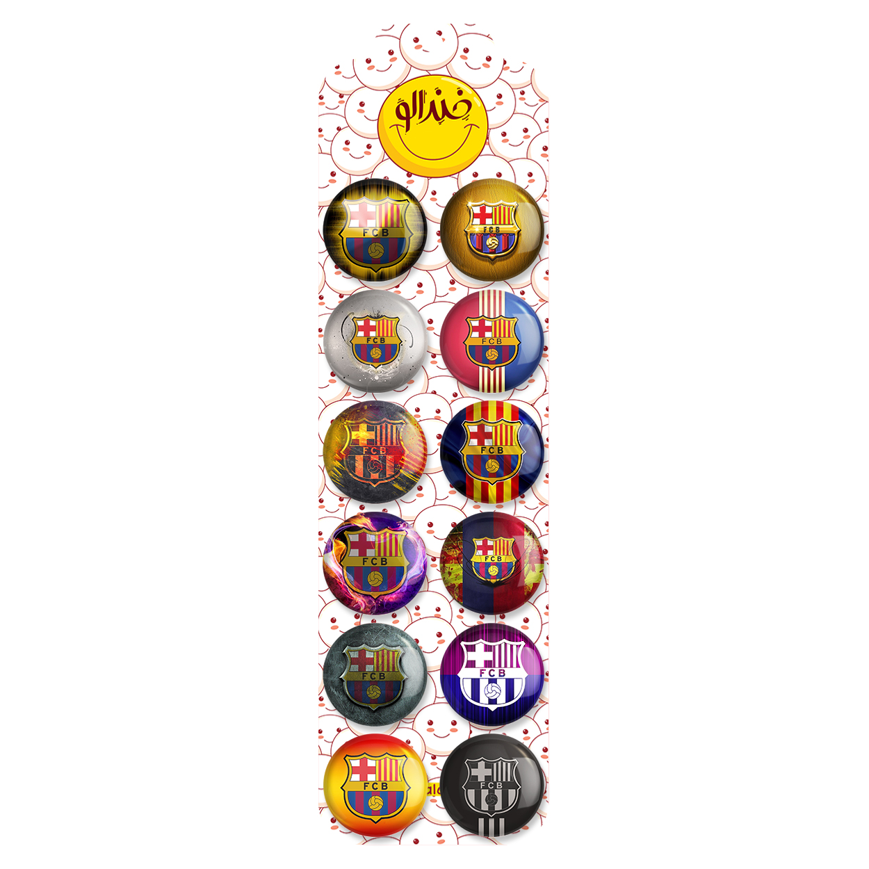 پک 12 عددی پیکسل خندالو طرح بارسلونا (Barcelona) با روکش سلفون حرارتی براق ضدخش و قطعه پشتی رنگی تولید شده است. قطعات پشتی از میان 6 رنگ سفید، مشکی، صورتی، زرد، آبی و قرمز که با توجه به نوع و رنگبندی طرح روی پیکسل انتخاب شده اند تولید می شود و در هر بسته بندی مطابق عکس محصول می باشد. قطعات پلاستیکی پشت پیکسل با سوزن یک تکه ثابت و بدون لغزش و جا به جایی، ایستایی بسیار بهتری نسبت به پشتی فلزی پیکسل دارند که این مهم در تولید این محصول نیز رعایت شده است. چاپ پیکسل طرح بارسلونا (Barcelona) بسته ۱۲ عددی نیز با دستگاه های استاندارد و با بهترین سطح کیفی صورت گرفته و طرح با شفافیتی مثال زدنی و با سلفونی بدون شکست نور بر روی پیکسل نقش بسته است.