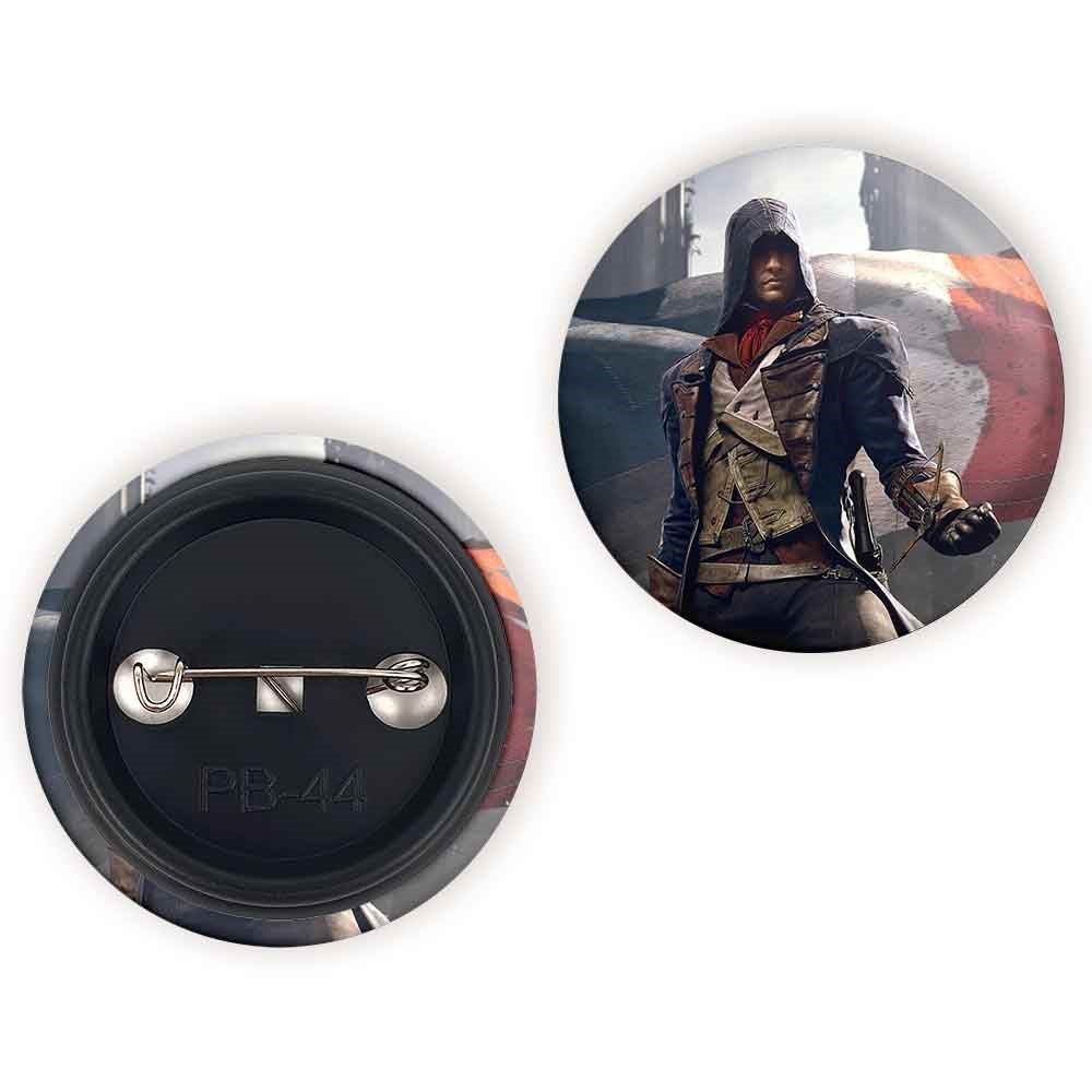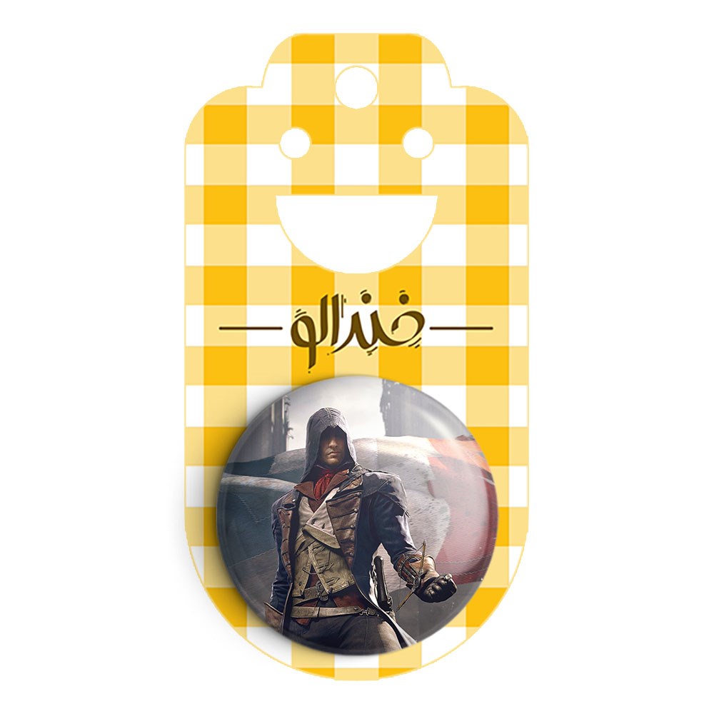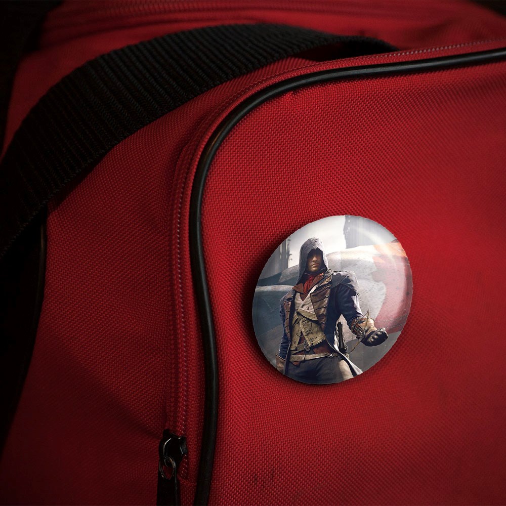 پیکسل 44 میلی متری بازی اساسینز کرید Assassin’s Creed خندالو با روکش سلفون حرارتی مات مخملی ضدخش و قطعه پشتی رنگی تولید شده است.پلاستیکی پشت پیکسل با سوزن یک تکه ثابت و بدون لغزش و جا به جایی، ایستایی بسیار بهتری نسبت به پشتی فلزی پیکسل دارند که این مهم در تولید این محصول نیز رعایت شده است.