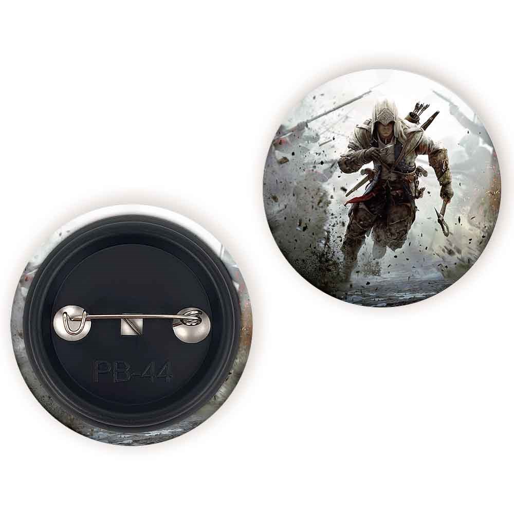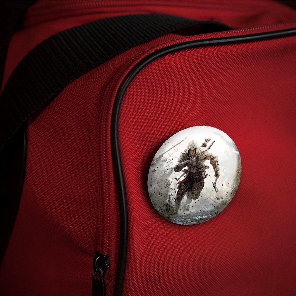 پیکسل 44 میلی متری بازی اساسینز کرید Assassin’s Creed خندالو با روکش سلفون حرارتی مات مخملی ضدخش و قطعه پشتی رنگی تولید شده است.پلاستیکی پشت پیکسل با سوزن یک تکه ثابت و بدون لغزش و جا به جایی، ایستایی بسیار بهتری نسبت به پشتی فلزی پیکسل دارند که این مهم در تولید این محصول نیز رعایت شده است.