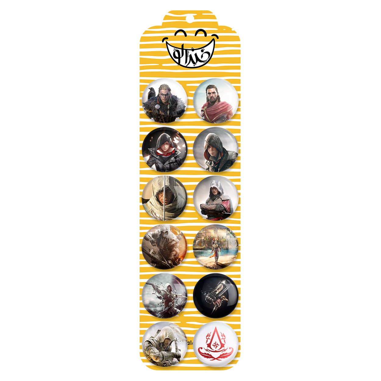 پک 12 عددی پیکسل خندالو طرح بازی اساسینز کرید (Assassin’s Creed) با روکش سلفون حرارتی براق ضدخش و قطعه پشتی رنگی تولید شده است. قطعات پشتی از میان 6 رنگ سفید، مشکی، صورتی، زرد، آبی و قرمز که با توجه به نوع و رنگبندی طرح روی پیکسل انتخاب شده اند تولید می شود و در هر بسته بندی مطابق عکس محصول می باشد. قطعات پلاستیکی پشت پیکسل با سوزن یک تکه ثابت و بدون لغزش و جا به جایی، ایستایی بسیار بهتری نسبت به پشتی فلزی پیکسل دارند که این مهم در تولید این محصول نیز رعایت شده است.