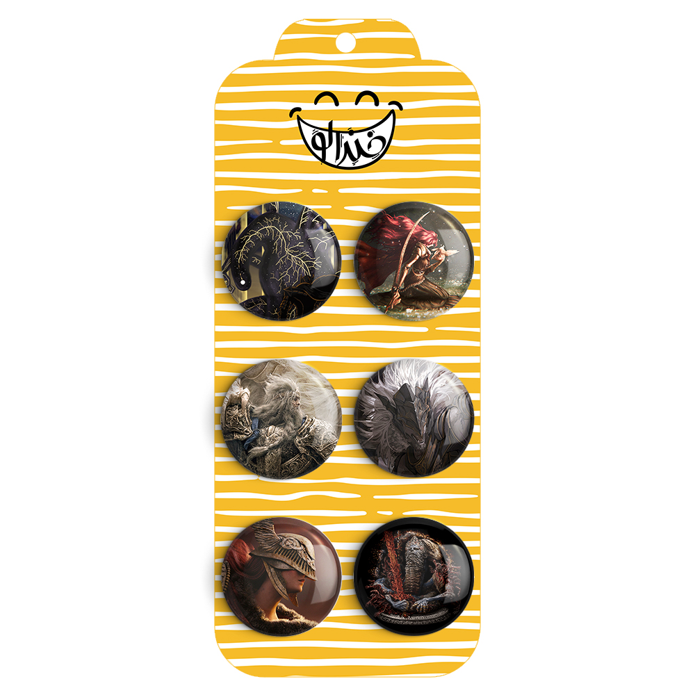 مجموعه 6 عددی پیکسل خندالو طرح بازی الدن رینگ (Elden Ring) با روکش سلفون حرارتی براق ضدخش و قطعه پشتی رنگی تولید شده است. قطعات پشتی از میان 6 رنگ سفید، مشکی، صورتی، زرد، آبی و قرمز که با توجه به نوع و رنگبندی طرح روی پیکسل انتخاب شده اند تولید می شود و در هر بسته بندی مطابق عکس محصول می باشد.