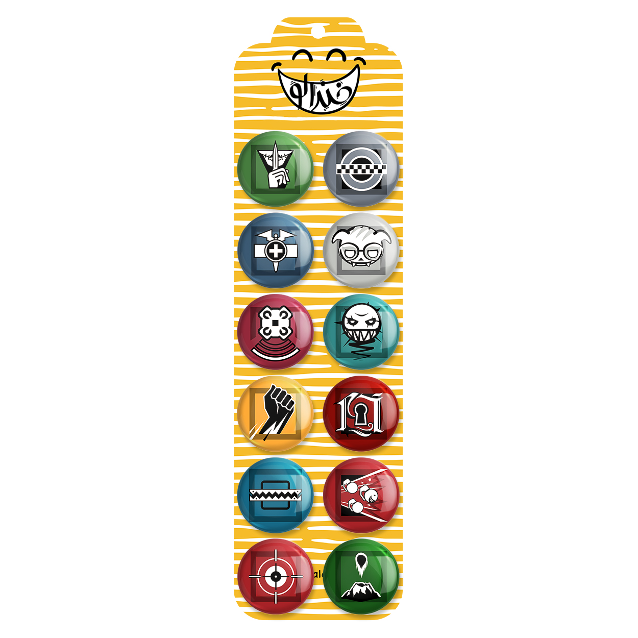 پک 12 عددی پیکسل خندالو طرح بازی رینبو سیکس سیج (Rainbow Six Siege) با روکش سلفون حرارتی براق ضدخش و قطعه پشتی رنگی تولید شده است. قطعات پشتی از میان 6 رنگ سفید، مشکی، صورتی، زرد، آبی و قرمز که با توجه به نوع و رنگبندی طرح روی پیکسل انتخاب شده اند تولید می شود و در هر بسته بندی مطابق عکس محصول می باشد. قطعات پلاستیکی پشت پیکسل با سوزن یک تکه ثابت و بدون لغزش و جا به جایی، ایستایی بسیار بهتری نسبت به پشتی فلزی پیکسل دارند که این مهم در تولید این محصول نیز رعایت شده است.