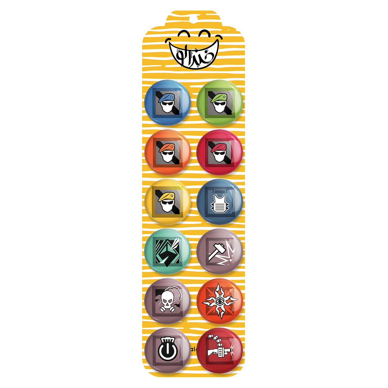 پک 12 عددی پیکسل خندالو طرح بازی رینبو سیکس سیج (Rainbow Six Siege) با روکش سلفون حرارتی براق ضدخش و قطعه پشتی رنگی تولید شده است. قطعات پشتی از میان 6 رنگ سفید، مشکی، صورتی، زرد، آبی و قرمز که با توجه به نوع و رنگبندی طرح روی پیکسل انتخاب شده اند تولید می شود و در هر بسته بندی مطابق عکس محصول می باشد. قطعات پلاستیکی پشت پیکسل با سوزن یک تکه ثابت و بدون لغزش و جا به جایی، ایستایی بسیار بهتری نسبت به پشتی فلزی پیکسل دارند که این مهم در تولید این محصول نیز رعایت شده است.