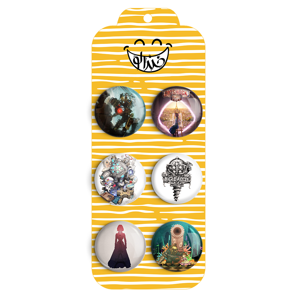 مجموعه 6 عددی پیکسل خندالو طرح بایوشاک (Bioshock) با روکش سلفون حرارتی براق ضدخش و قطعه پشتی رنگی تولید شده است. قطعات پشتی از میان 6 رنگ سفید، مشکی، صورتی، زرد، آبی و قرمز که با توجه به نوع و رنگبندی طرح روی پیکسل انتخاب شده اند تولید می شود و در هر بسته بندی مطابق عکس محصول می باشد.