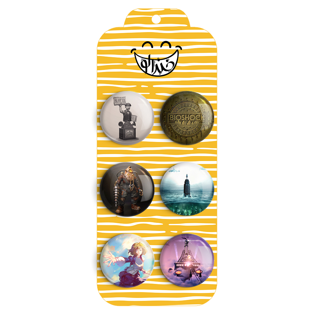 مجموعه 6 عددی پیکسل خندالو طرح بایوشاک (Bioshock) با روکش سلفون حرارتی براق ضدخش و قطعه پشتی رنگی تولید شده است. قطعات پشتی از میان 6 رنگ سفید، مشکی، صورتی، زرد، آبی و قرمز که با توجه به نوع و رنگبندی طرح روی پیکسل انتخاب شده اند تولید می شود و در هر بسته بندی مطابق عکس محصول می باشد.