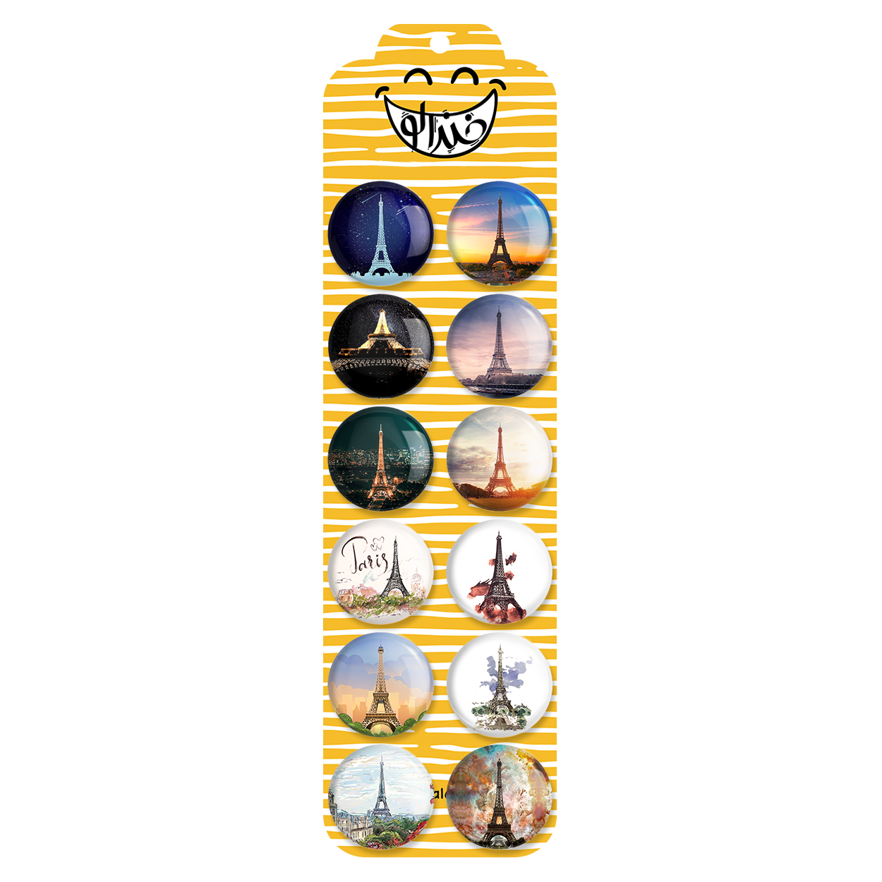پک 12 عددی پیکسل خندالو طرح برج ایفل با روکش سلفون حرارتی براق ضدخش و قطعه پشتی رنگی تولید شده است. قطعات پشتی از میان 6 رنگ سفید، مشکی، صورتی، زرد، آبی و قرمز که با توجه به نوع و رنگبندی طرح روی پیکسل انتخاب شده اند تولید می شود و در هر بسته بندی مطابق عکس محصول می باشد. قطعات پلاستیکی پشت پیکسل با سوزن یک تکه ثابت و بدون لغزش و جا به جایی، ایستایی بسیار بهتری نسبت به پشتی فلزی پیکسل دارند که این مهم در تولید این محصول نیز رعایت شده است.