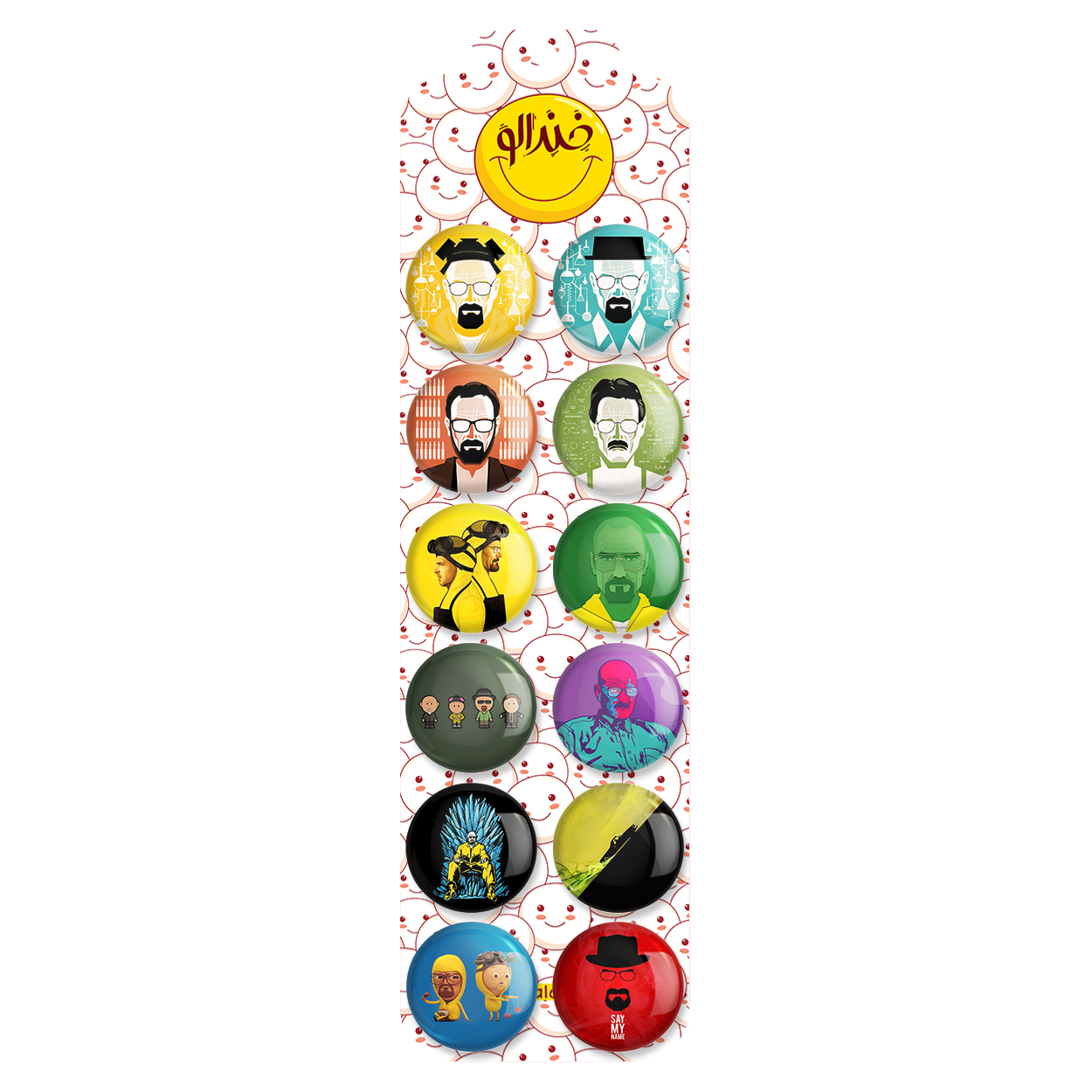 پک 12 عددی پیکسل خندالو طرح بریکینگ بد (Breaking Bad) با روکش سلفون حرارتی براق ضدخش و قطعه پشتی رنگی تولید شده است. قطعات پشتی از میان 6 رنگ سفید، مشکی، صورتی، زرد، آبی و قرمز که با توجه به نوع و رنگبندی طرح روی پیکسل انتخاب شده اند تولید می شود و در هر بسته بندی مطابق عکس محصول می باشد. قطعات پلاستیکی پشت پیکسل با سوزن یک تکه ثابت و بدون لغزش و جا به جایی، ایستایی بسیار بهتری نسبت به پشتی فلزی پیکسل دارند که این مهم در تولید این محصول نیز رعایت شده است.