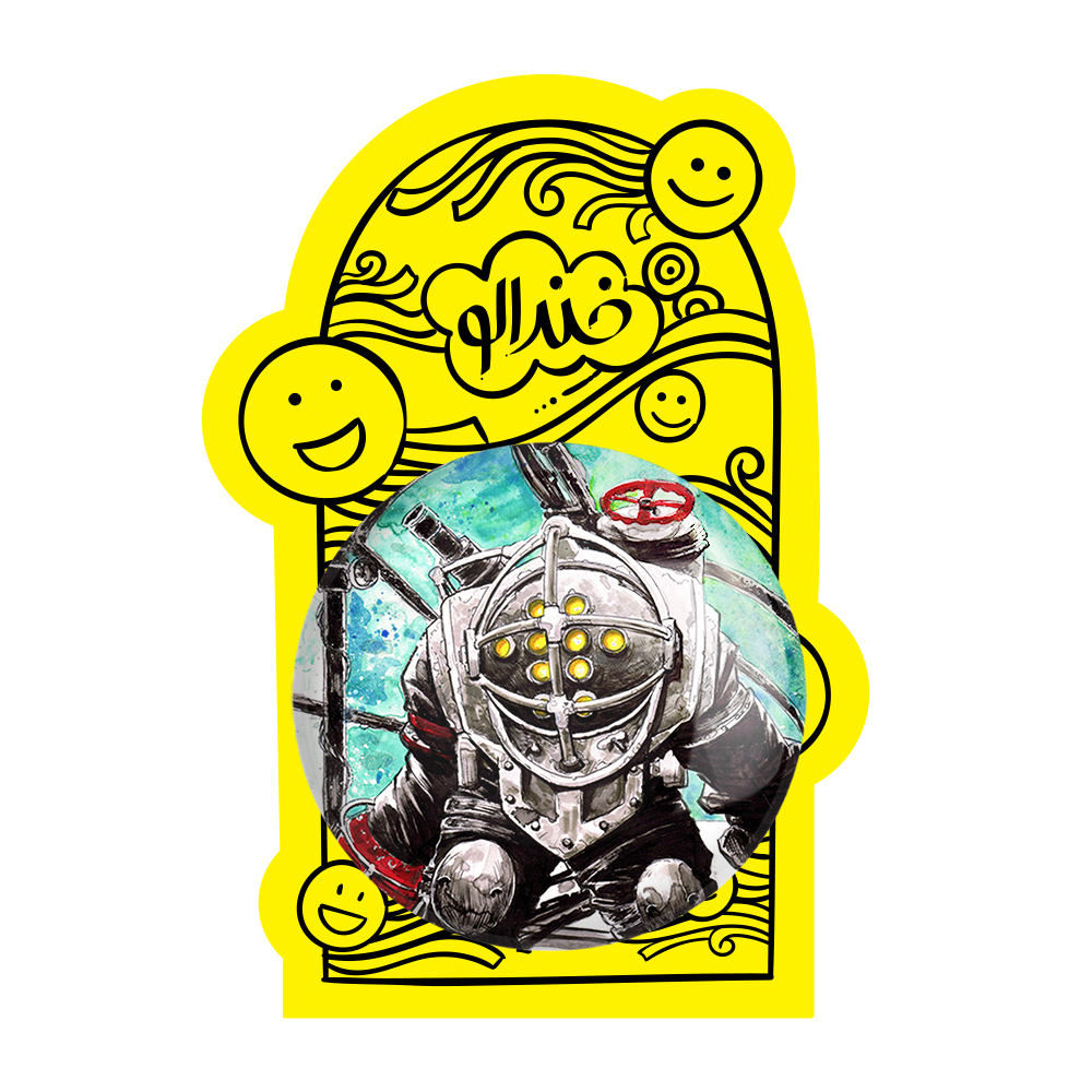 پیکسل بزرگ بازی بایوشاک (Bioshock) خندالو با روکش سلفون حرارتی مات مخملی ضدخش و قطعه پشتی فلزی تولید می شود. قطعات پشت پیکسل های خندالو با سوزن یک تکه ثابت و بدون لغزش و جا به جایی، ایستایی بسیار خوبی دارند که این مهم در تولید پیکسل های 58 میلیمتری نیز رعایت شده است.