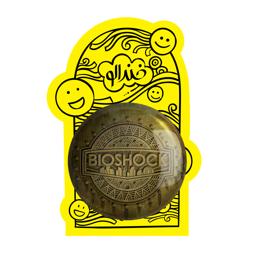 پیکسل بزرگ بازی بایوشاک (Bioshock) خندالو با روکش سلفون حرارتی مات مخملی ضدخش و قطعه پشتی فلزی تولید می شود. قطعات پشت پیکسل های خندالو با سوزن یک تکه ثابت و بدون لغزش و جا به جایی، ایستایی بسیار خوبی دارند که این مهم در تولید پیکسل های 58 میلیمتری نیز رعایت شده است.