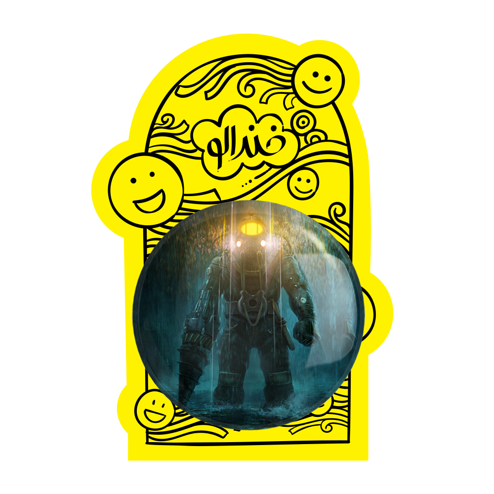 پیکسل بزرگ بازی بایوشاک (Bioshock) خندالو با روکش سلفون حرارتی مات مخملی ضدخش و قطعه پشتی فلزی تولید می شود. قطعات پشت پیکسل های خندالو با سوزن یک تکه ثابت و بدون لغزش و جا به جایی، ایستایی بسیار خوبی دارند که این مهم در تولید پیکسل های 58 میلیمتری نیز رعایت شده است.
