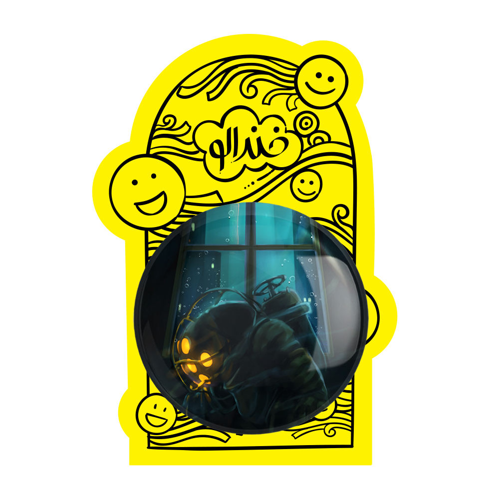 پیکسل بزرگ بازی بایوشاک (Bioshock) خندالو با روکش سلفون حرارتی مات مخملی ضدخش و قطعه پشتی فلزی تولید می شود. قطعات پشت پیکسل های خندالو با سوزن یک تکه ثابت و بدون لغزش و جا به جایی، ایستایی بسیار خوبی دارند که این مهم در تولید پیکسل های 58 میلیمتری نیز رعایت شده است.