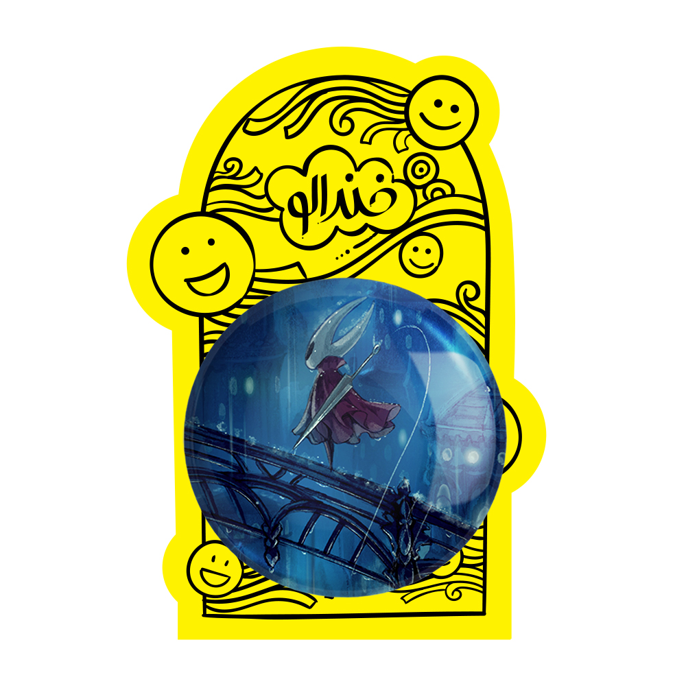 پیکسل بزرگ بازی هالو نایت (Hollow Knight) خندالو با روکش سلفون حرارتی مات مخملی ضدخش و قطعه پشتی فلزی تولید می شود. قطعات پشت پیکسل های خندالو با سوزن یک تکه ثابت و بدون لغزش و جا به جایی، ایستایی بسیار خوبی دارند که این مهم در تولید پیکسل های 58 میلیمتری نیز رعایت شده است.