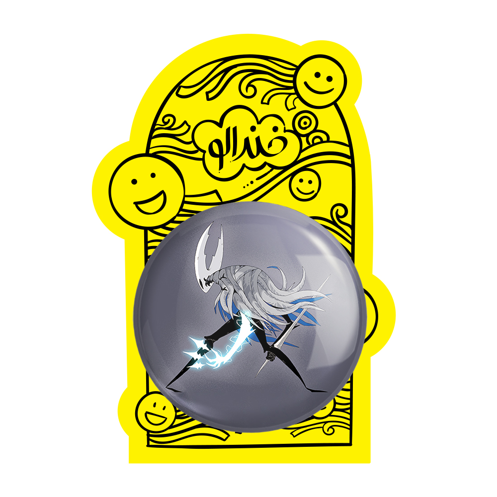 پیکسل بزرگ بازی هالو نایت (Hollow Knight) خندالو با روکش سلفون حرارتی مات مخملی ضدخش و قطعه پشتی فلزی تولید می شود. قطعات پشت پیکسل های خندالو با سوزن یک تکه ثابت و بدون لغزش و جا به جایی، ایستایی بسیار خوبی دارند که این مهم در تولید پیکسل های 58 میلیمتری نیز رعایت شده است.