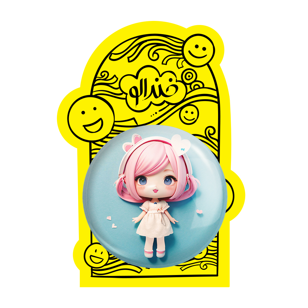 پیکسل بزرگ دخترانه (Girlish) خندالو با روکش سلفون حرارتی مات مخملی ضدخش و قطعه پشتی فلزی تولید می شود. قطعات پشت پیکسل های خندالو با سوزن یک تکه ثابت و بدون لغزش و جا به جایی، ایستایی بسیار خوبی دارند که این مهم در تولید پیکسل های 58 میلیمتری نیز رعایت شده است.