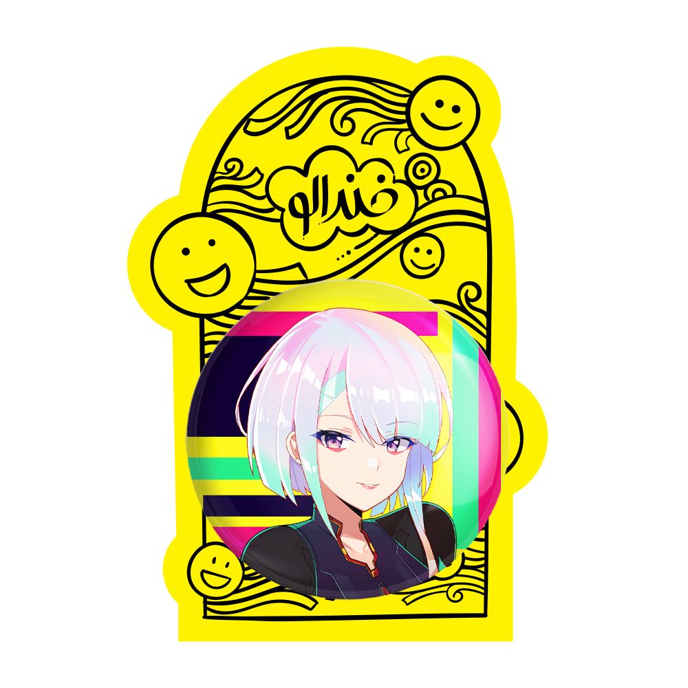پیکسل بزرگ لوسی انیمه سایبرپانک خندالو با روکش سلفون حرارتی مات مخملی ضدخش و قطعه پشتی فلزی تولید می شود. قطعات پشت پیکسل های خندالو با سوزن یک تکه ثابت و بدون لغزش و جا به جایی، ایستایی بسیار خوبی دارند که این مهم در تولید پیکسل های 58 میلیمتری نیز رعایت شده است.