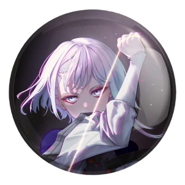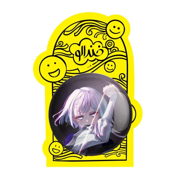 پیکسل بزرگ لوسی انیمه سایبر پانک Cyberpunk خندالو با روکش سلفون حرارتی مات مخملی ضدخش و قطعه پشتی فلزی تولید می شود. قطعات پشت پیکسل های خندالو با سوزن یک تکه ثابت و بدون لغزش و جا به جایی، ایستایی بسیار خوبی دارند که این مهم در تولید پیکسل های 58 میلیمتری نیز رعایت شده است.