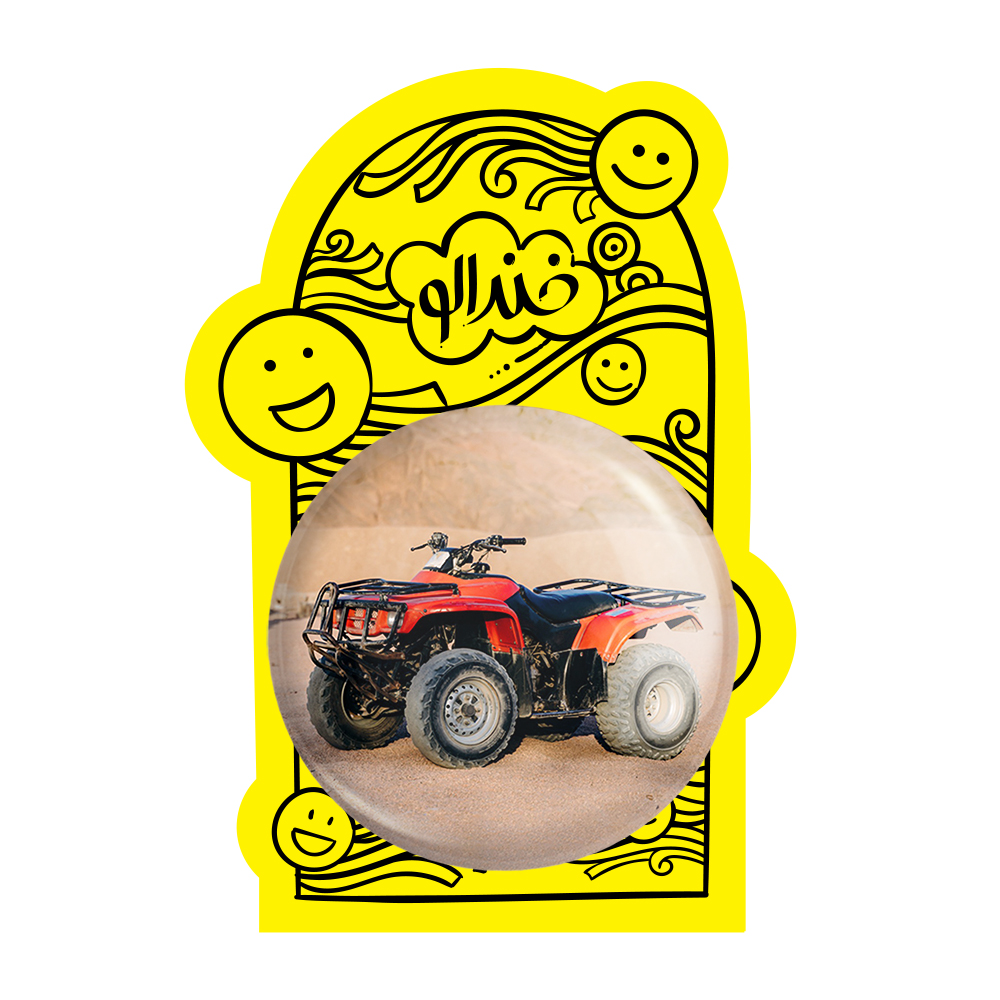 پیکسل بزرگ موتور چهار چرخ خندالو با روکش سلفون حرارتی مات مخملی ضدخش و قطعه پشتی فلزی تولید می شود. قطعات پشت پیکسل های خندالو با سوزن یک تکه ثابت و بدون لغزش و جا به جایی، ایستایی بسیار خوبی دارند که این مهم در تولید پیکسل های 58 میلیمتری نیز رعایت شده است.