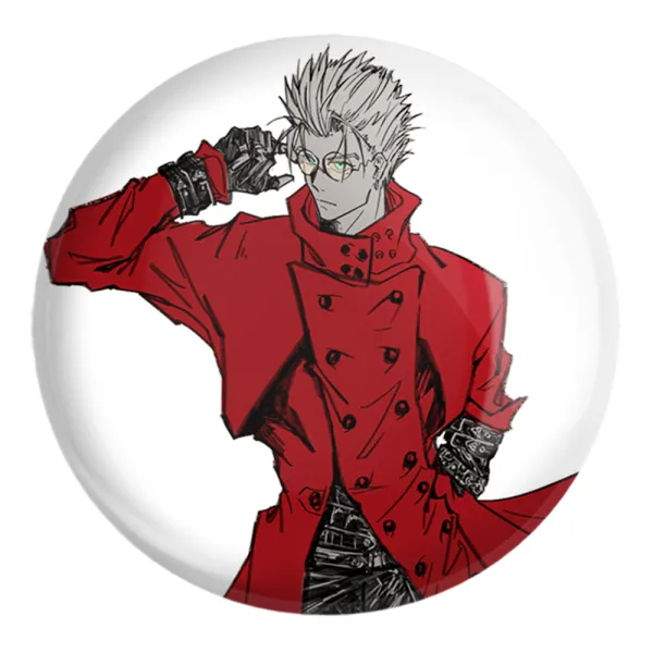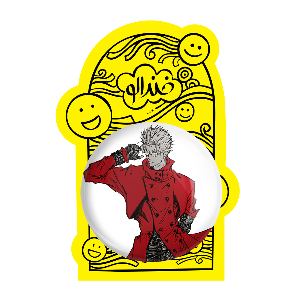 پیکسل بزرگ وش انیمه تریگان (Trigun) خندالو با روکش سلفون حرارتی مات مخملی ضدخش و قطعه پشتی فلزی تولید می شود. قطعات پشت پیکسل های خندالو با سوزن یک تکه ثابت و بدون لغزش و جا به جایی، ایستایی بسیار خوبی دارند که این مهم در تولید پیکسل های 58 میلیمتری نیز رعایت شده است.