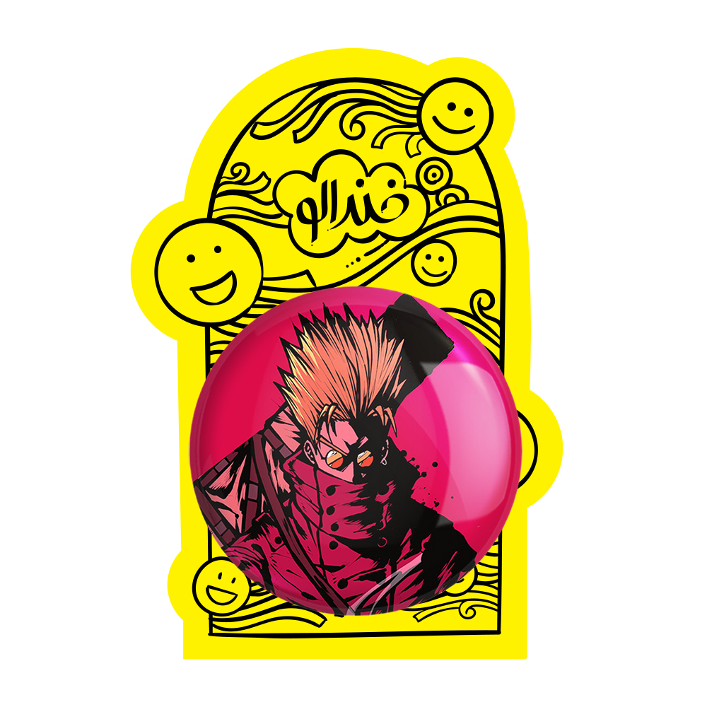 پیکسل بزرگ وش انیمه تریگان (Trigun) خندالو با روکش سلفون حرارتی مات مخملی ضدخش و قطعه پشتی فلزی تولید می شود. قطعات پشت پیکسل های خندالو با سوزن یک تکه ثابت و بدون لغزش و جا به جایی، ایستایی بسیار خوبی دارند که این مهم در تولید پیکسل های 58 میلیمتری نیز رعایت شده است.