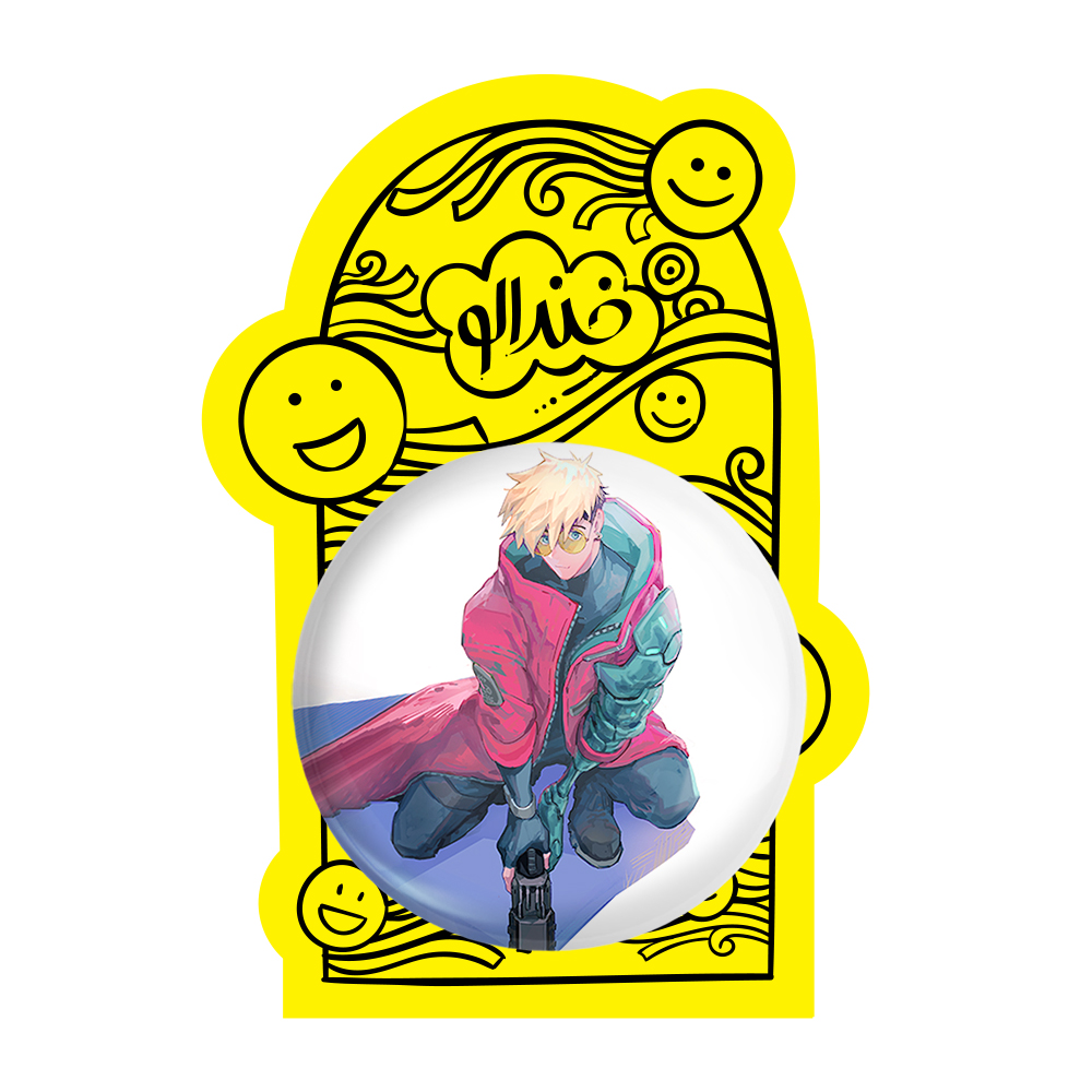 پیکسل بزرگ وش انیمه تریگان (Trigun) خندالو با روکش سلفون حرارتی مات مخملی ضدخش و قطعه پشتی فلزی تولید می شود. قطعات پشت پیکسل های خندالو با سوزن یک تکه ثابت و بدون لغزش و جا به جایی، ایستایی بسیار خوبی دارند که این مهم در تولید پیکسل های 58 میلیمتری نیز رعایت شده است.