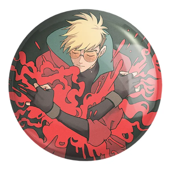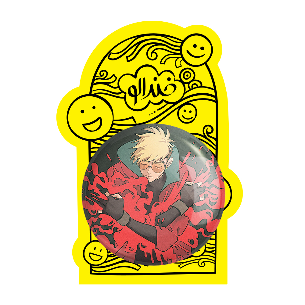 پیکسل بزرگ وش انیمه تریگان (Trigun) خندالو با روکش سلفون حرارتی مات مخملی ضدخش و قطعه پشتی فلزی تولید می شود. قطعات پشت پیکسل های خندالو با سوزن یک تکه ثابت و بدون لغزش و جا به جایی، ایستایی بسیار خوبی دارند که این مهم در تولید پیکسل های 58 میلیمتری نیز رعایت شده است.
