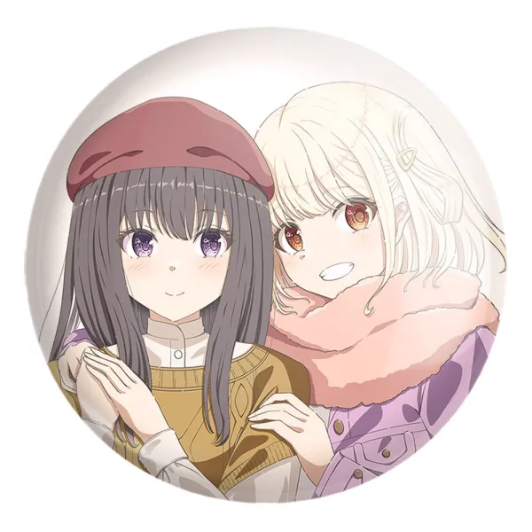 پیکسل بزرگ چیساتو و تاکینا انیمه لیکوریس ریکویل Lycoris Recoil خندالو با روکش سلفون حرارتی مات مخملی ضدخش و قطعه پشتی فلزی تولید می شود. قطعات پشت پیکسل های خندالو با سوزن یک تکه ثابت و بدون لغزش و جا به جایی، ایستایی بسیار خوبی دارند که این مهم در تولید پیکسل های 58 میلیمتری نیز رعایت شده است.
