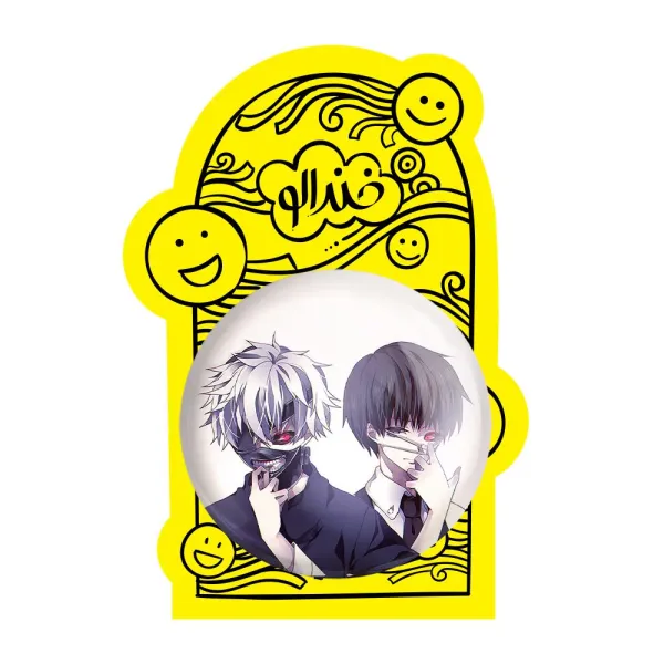 پیکسل بزرگ کانکی کن انیمه توکیو غول Tokyo Ghoul خندالو با روکش سلفون حرارتی مات مخملی ضدخش و قطعه پشتی فلزی تولید می شود. قطعات پشت پیکسل های خندالو با سوزن یک تکه ثابت و بدون لغزش و جا به جایی، ایستایی بسیار خوبی دارند که این مهم در تولید پیکسل های 58 میلیمتری نیز رعایت شده است.