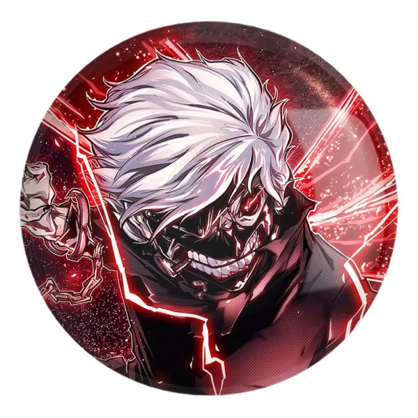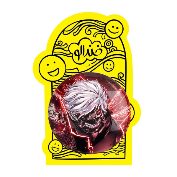 پیکسل بزرگ کانکی کن انیمه توکیو غول Tokyo Ghoul خندالو با روکش سلفون حرارتی مات مخملی ضدخش و قطعه پشتی فلزی تولید می شود. قطعات پشت پیکسل های خندالو با سوزن یک تکه ثابت و بدون لغزش و جا به جایی، ایستایی بسیار خوبی دارند که این مهم در تولید پیکسل های 58 میلیمتری نیز رعایت شده است.