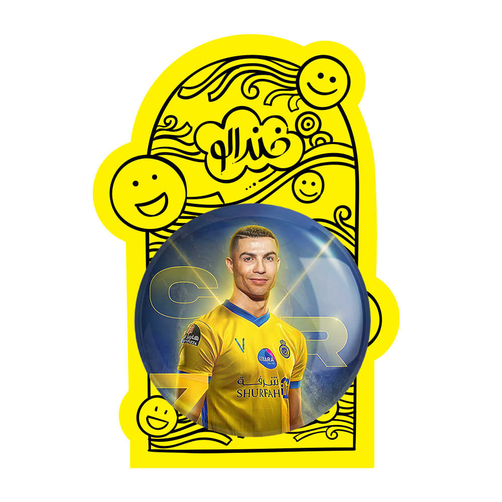 پیکسل بزرگ کریستیانو رونالدو خندالو با روکش سلفون حرارتی مات مخملی ضدخش و قطعه پشتی فلزی تولید می شود. قطعات پشت پیکسل های خندالو با سوزن یک تکه ثابت و بدون لغزش و جا به جایی، ایستایی بسیار خوبی دارند که این مهم در تولید پیکسل های 58 میلیمتری نیز رعایت شده است.