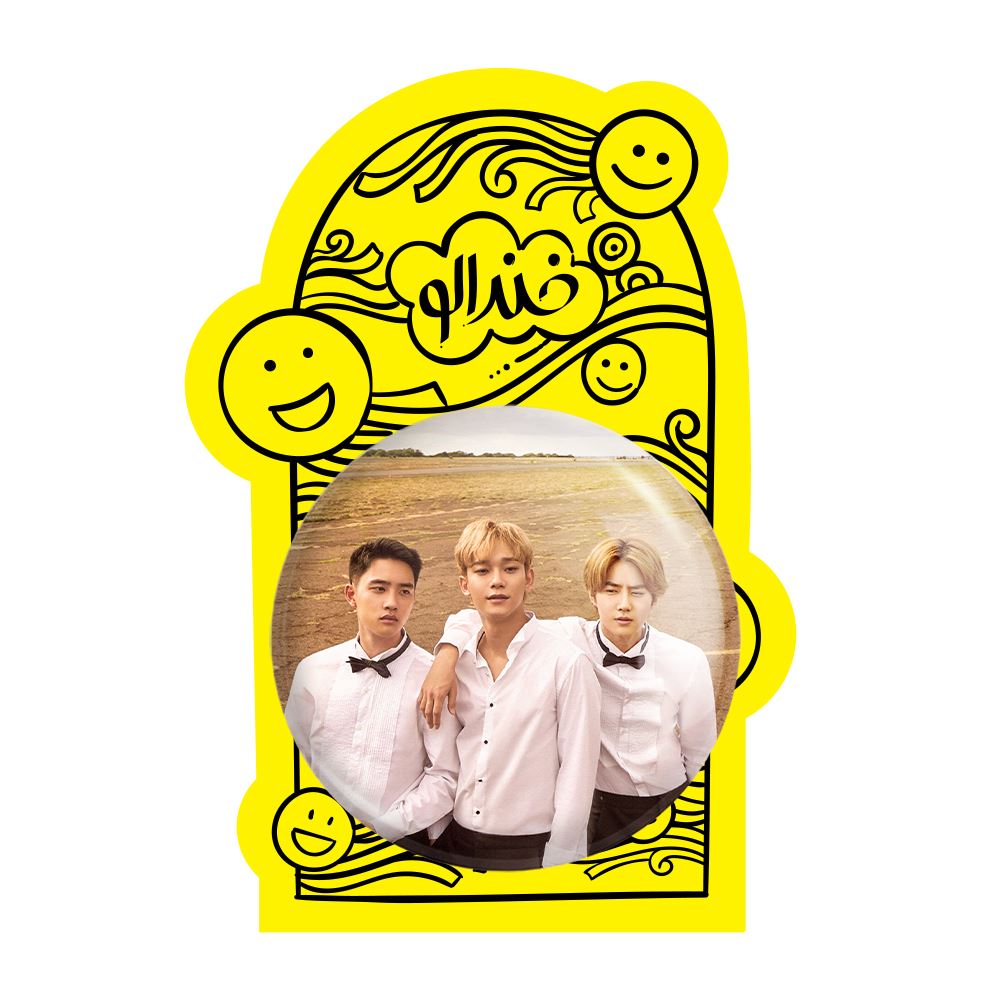 پیکسل بزرگ گروه اکسو EXO خندالو با روکش سلفون حرارتی مات مخملی ضدخش و قطعه پشتی فلزی تولید می شود. قطعات پشت پیکسل های خندالو با سوزن یک تکه ثابت و بدون لغزش و جا به جایی، ایستایی بسیار خوبی دارند که این مهم در تولید پیکسل های 58 میلیمتری نیز رعایت شده است.