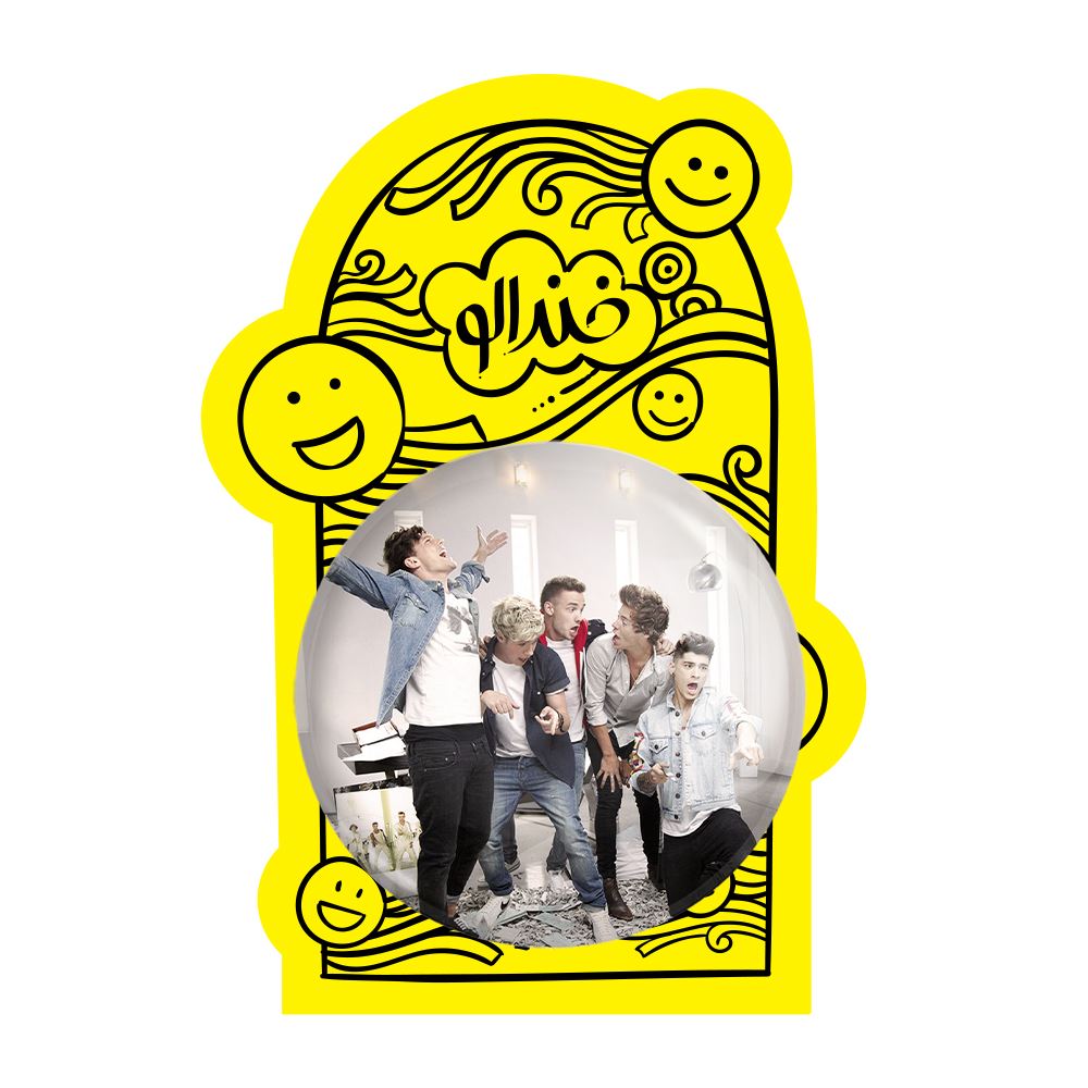 پیکسل بزرگ گروه موسیقی وان دایرکشن One Direction خندالو با روکش سلفون حرارتی مات مخملی ضدخش و قطعه پشتی فلزی تولید می شود. قطعات پشت پیکسل های خندالو با سوزن یک تکه ثابت و بدون لغزش و جا به جایی، ایستایی بسیار خوبی دارند که این مهم در تولید پیکسل های 58 میلیمتری نیز رعایت شده است.