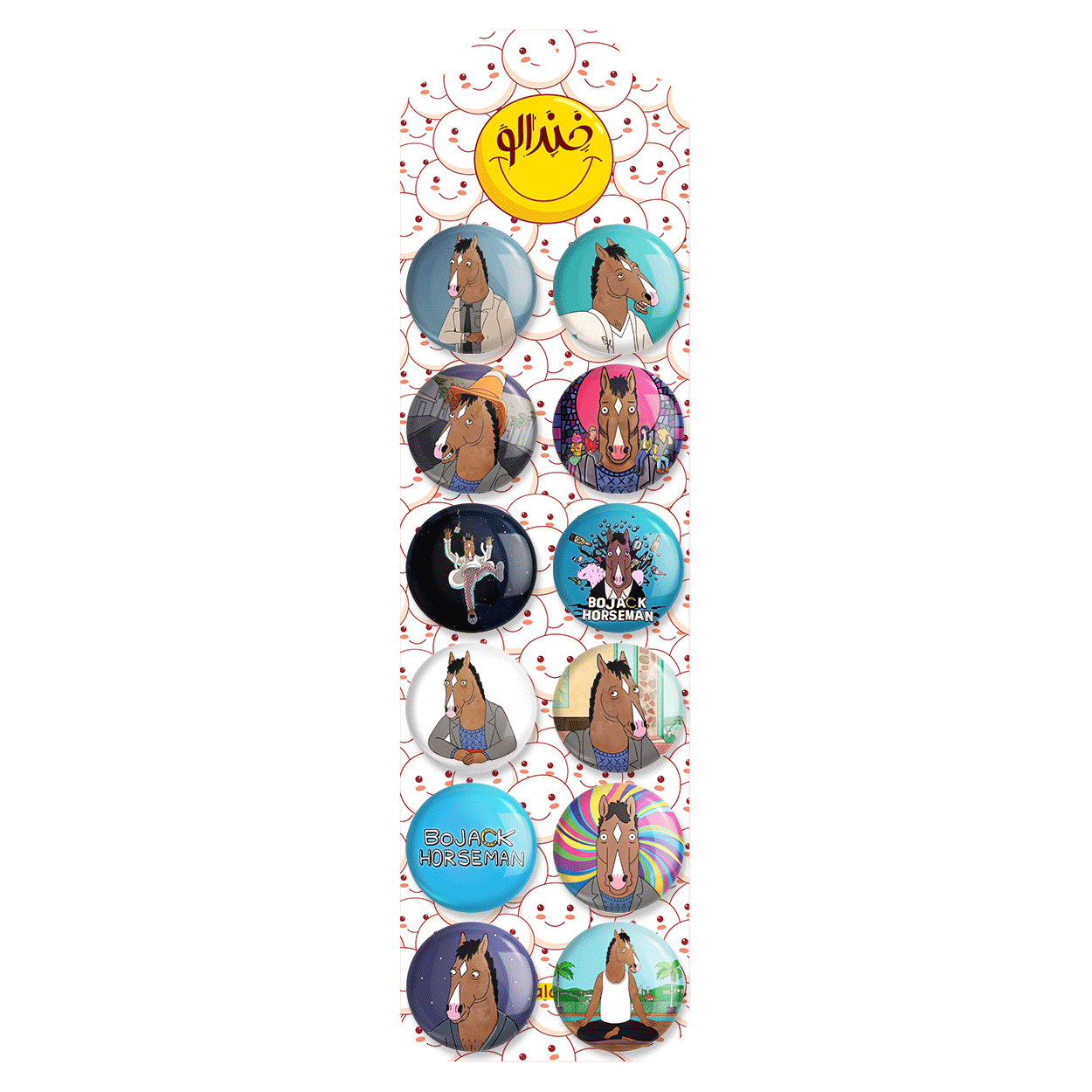 پک 12 عددی پیکسل خندالو طرح بوجک هورسمن (Bojack Horseman) با روکش سلفون حرارتی براق ضدخش و قطعه پشتی رنگی تولید شده است. قطعات پشتی از میان 6 رنگ سفید، مشکی، صورتی، زرد، آبی و قرمز که با توجه به نوع و رنگبندی طرح روی پیکسل انتخاب شده اند تولید می شود و در هر بسته بندی مطابق عکس محصول می باشد. قطعات پلاستیکی پشت پیکسل با سوزن یک تکه ثابت و بدون لغزش و جا به جایی، ایستایی بسیار بهتری نسبت به پشتی فلزی پیکسل دارند که این مهم در تولید این محصول نیز رعایت شده است. چاپ پیکسل طرح بوجک هورسمن (Bojack Horseman) بسته ۱۲ عددی نیز با دستگاه های استاندارد و با بهترین سطح کیفی صورت گرفته و طرح با شفافیتی مثال زدنی و با سلفونی بدون شکست نور بر روی پیکسل نقش بسته است.