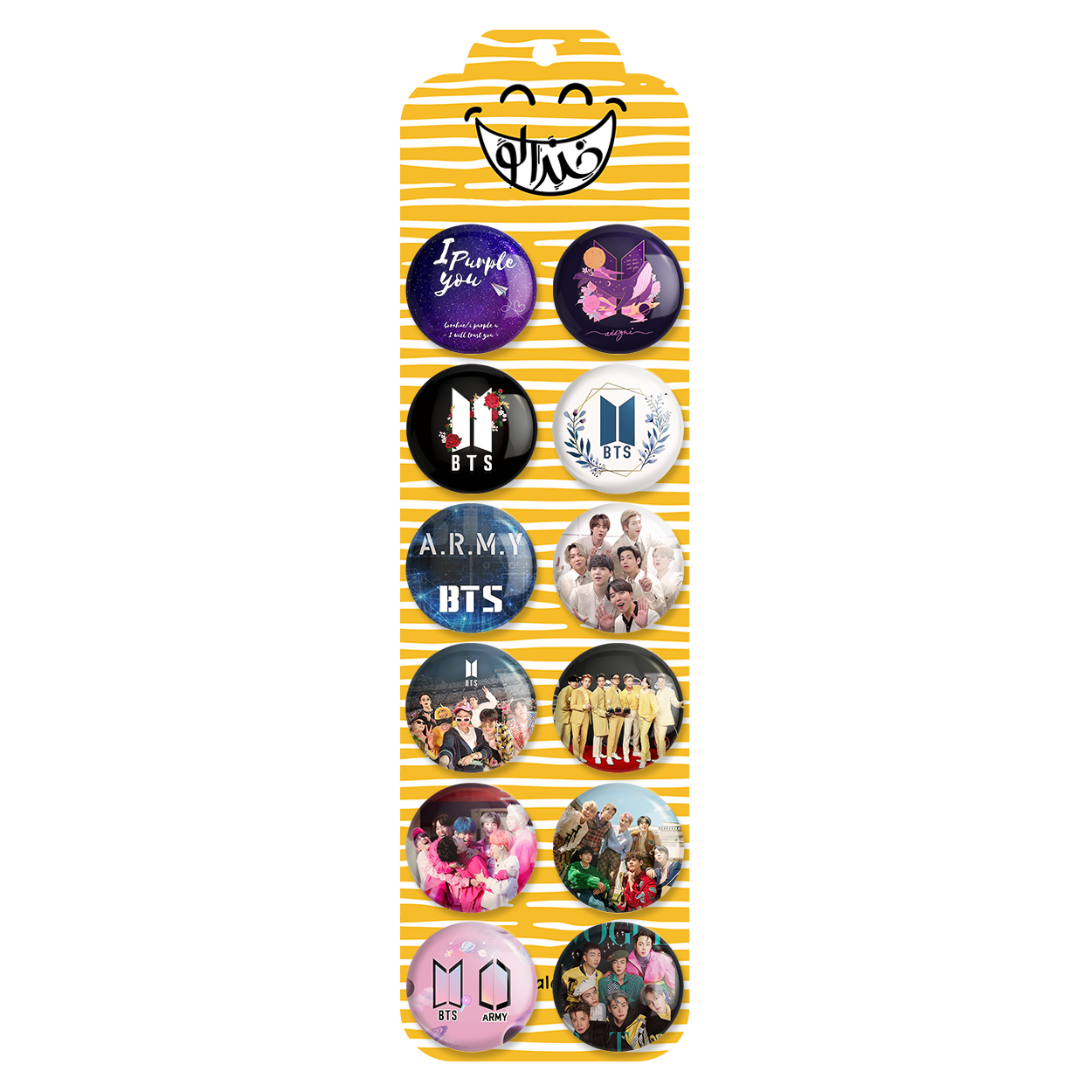 پک 12 عددی پیکسل خندالو طرح بی تی اس BTS با روکش سلفون حرارتی براق ضدخش و قطعه پشتی رنگی تولید شده است. قطعات پشتی از میان 6 رنگ سفید، مشکی، صورتی، زرد، آبی و قرمز که با توجه به نوع و رنگبندی طرح روی پیکسل انتخاب شده اند تولید می شود و در هر بسته بندی مطابق عکس محصول می باشد. قطعات پلاستیکی پشت پیکسل با سوزن یک تکه ثابت و بدون لغزش و جا به جایی، ایستایی بسیار بهتری نسبت به پشتی فلزی پیکسل دارند که این مهم در تولید این محصول نیز رعایت شده است.
