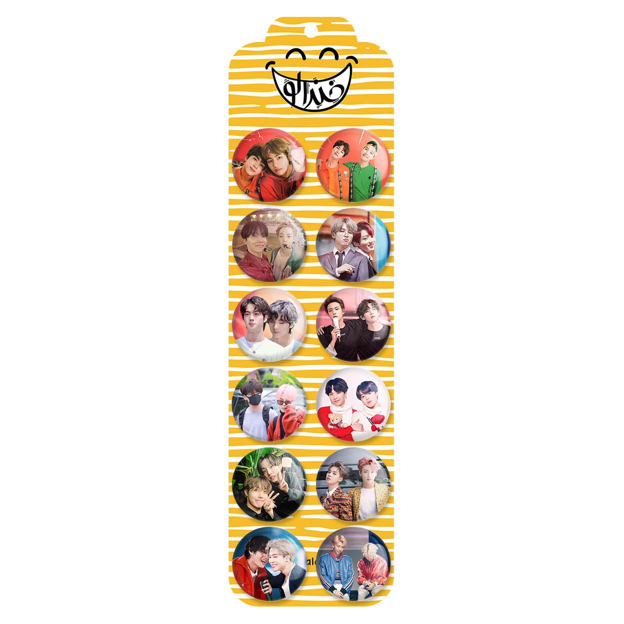 پک 12 عددی پیکسل خندالو طرح بی تی اس BTS با روکش سلفون حرارتی براق ضدخش و قطعه پشتی رنگی تولید شده است. قطعات پشتی از میان 6 رنگ سفید، مشکی، صورتی، زرد، آبی و قرمز که با توجه به نوع و رنگبندی طرح روی پیکسل انتخاب شده اند تولید می شود و در هر بسته بندی مطابق عکس محصول می باشد. قطعات پلاستیکی پشت پیکسل با سوزن یک تکه ثابت و بدون لغزش و جا به جایی، ایستایی بسیار بهتری نسبت به پشتی فلزی پیکسل دارند که این مهم در تولید این محصول نیز رعایت شده است.