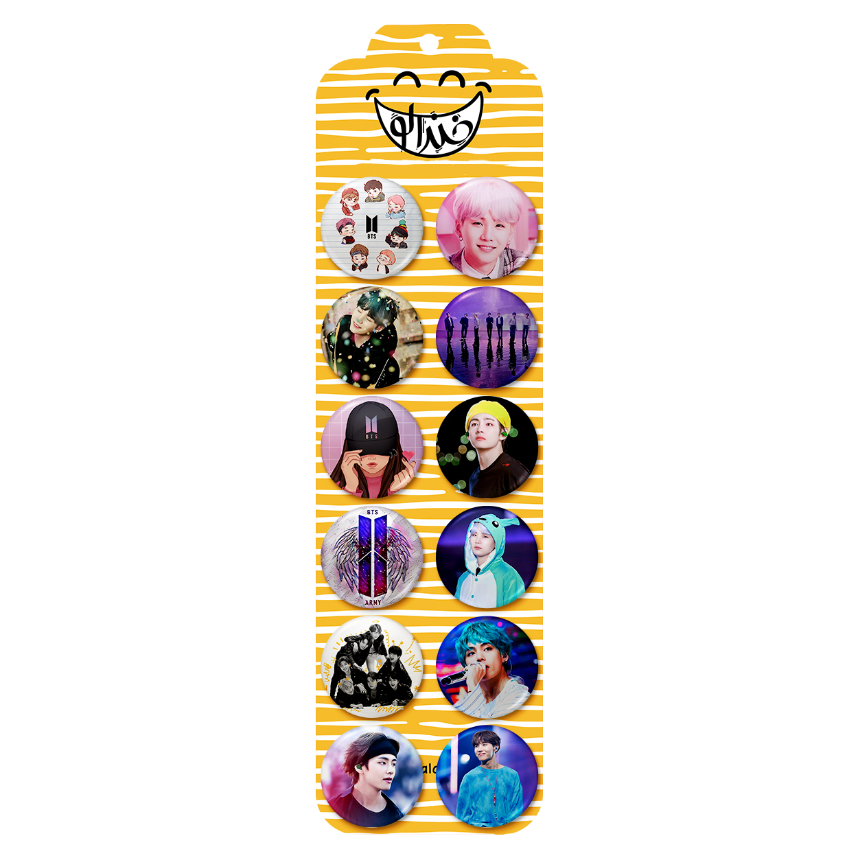 پک 12 عددی پیکسل خندالو طرح بی تی اس (BTS) با روکش سلفون حرارتی براق ضدخش و قطعه پشتی رنگی تولید شده است. قطعات پشتی از میان 6 رنگ سفید، مشکی، صورتی، زرد، آبی و قرمز که با توجه به نوع و رنگبندی طرح روی پیکسل انتخاب شده اند تولید می شود و در هر بسته بندی مطابق عکس محصول می باشد. قطعات پلاستیکی پشت پیکسل با سوزن یک تکه ثابت و بدون لغزش و جا به جایی، ایستایی بسیار بهتری نسبت به پشتی فلزی پیکسل دارند که این مهم در تولید این محصول نیز رعایت شده است.