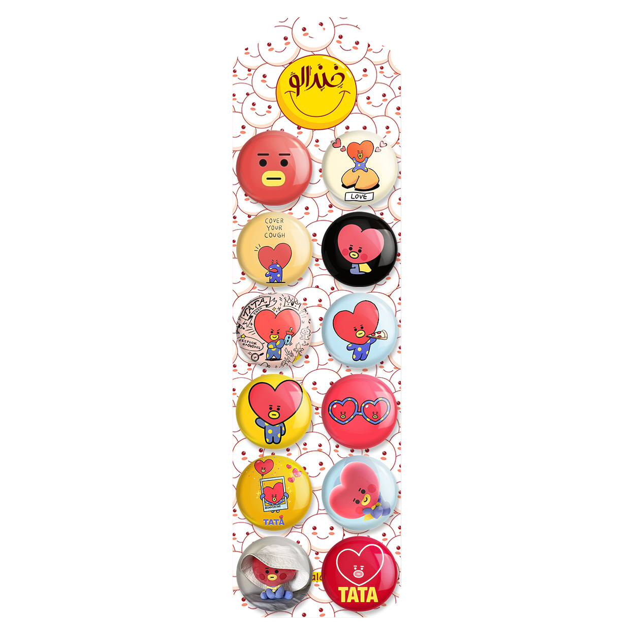 پک 12 عددی پیکسل خندالو طرح تاتا BT21 Tata با روکش سلفون حرارتی براق ضدخش و قطعه پشتی رنگی تولید شده است. قطعات پشتی از میان 6 رنگ سفید، مشکی، صورتی، زرد، آبی و قرمز که با توجه به نوع و رنگبندی طرح روی پیکسل انتخاب شده اند تولید می شود و در هر بسته بندی مطابق عکس محصول می باشد. قطعات پلاستیکی پشت پیکسل با سوزن یک تکه ثابت و بدون لغزش و جا به جایی، ایستایی بسیار بهتری نسبت به پشتی فلزی پیکسل دارند که این مهم در تولید این محصول نیز رعایت شده است. چاپ پیکسل طرح تاتا BT21 Tata بسته ۱۲ عددی نیز با دستگاه های استاندارد و با بهترین سطح کیفی صورت گرفته و طرح با شفافیتی مثال زدنی و با سلفونی بدون شکست نور بر روی پیکسل نقش بسته است.