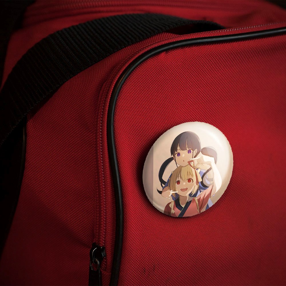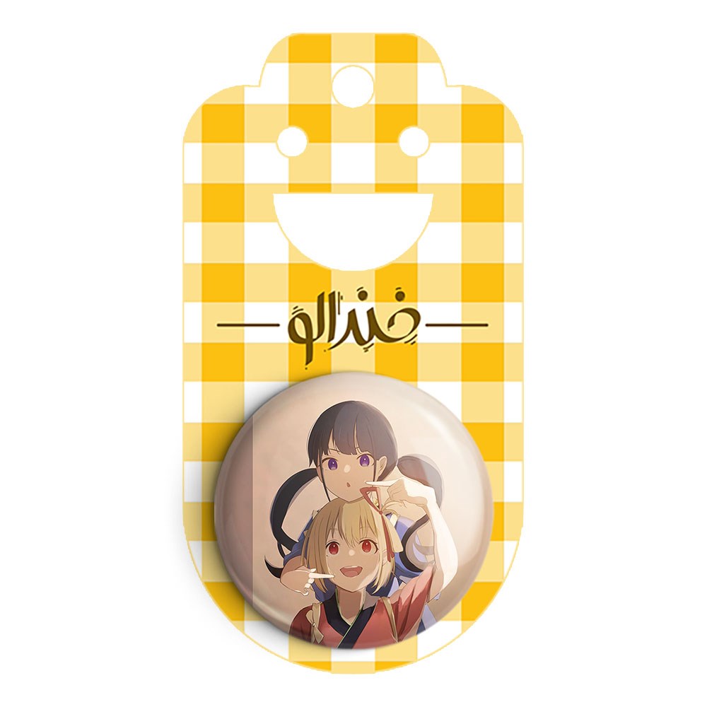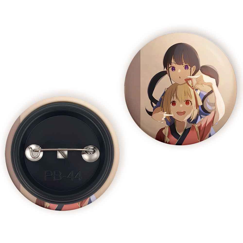 پیکسل 44 میلی متری تاکینا و چیساتو انیمه لیکوریس ریکویل Lycoris Recoil خندالو با روکش سلفون حرارتی مات مخملی ضدخش و قطعه پشتی رنگی تولید شده است.پلاستیکی پشت پیکسل با سوزن یک تکه ثابت و بدون لغزش و جا به جایی، ایستایی بسیار بهتری نسبت به پشتی فلزی پیکسل دارند که این مهم در تولید این محصول نیز رعایت شده است.