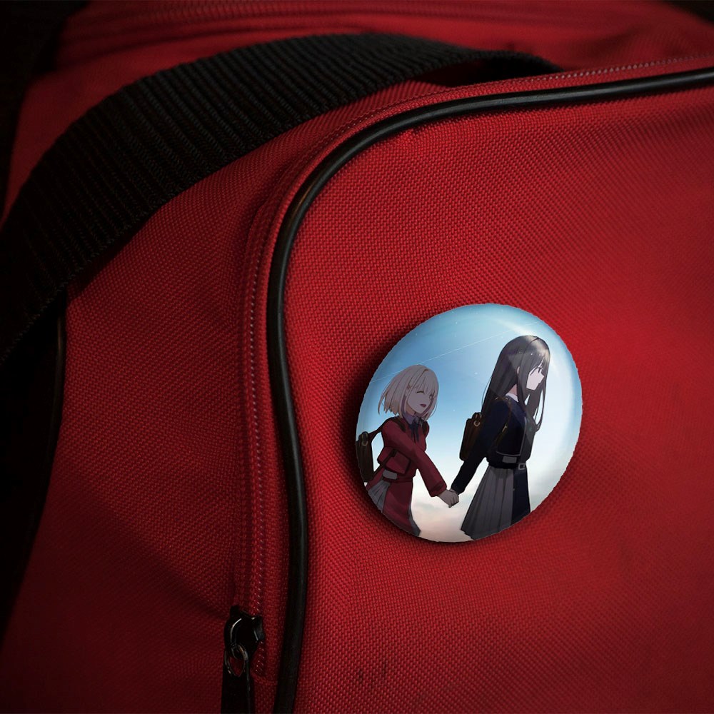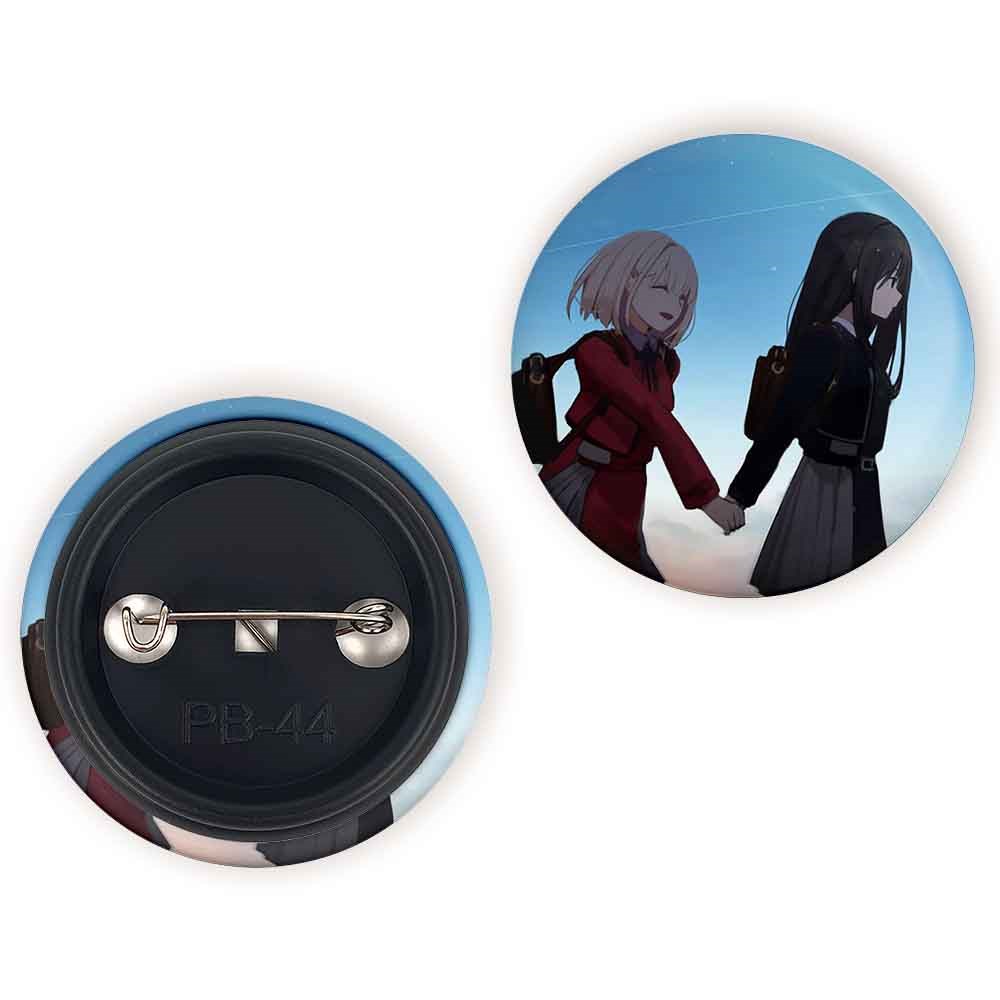 پیکسل 44 میلی متری تاکینا و چیساتو انیمه لیکوریس ریکویل Lycoris Recoil خندالو با روکش سلفون حرارتی مات مخملی ضدخش و قطعه پشتی رنگی تولید شده است.پلاستیکی پشت پیکسل با سوزن یک تکه ثابت و بدون لغزش و جا به جایی، ایستایی بسیار بهتری نسبت به پشتی فلزی پیکسل دارند که این مهم در تولید این محصول نیز رعایت شده است.