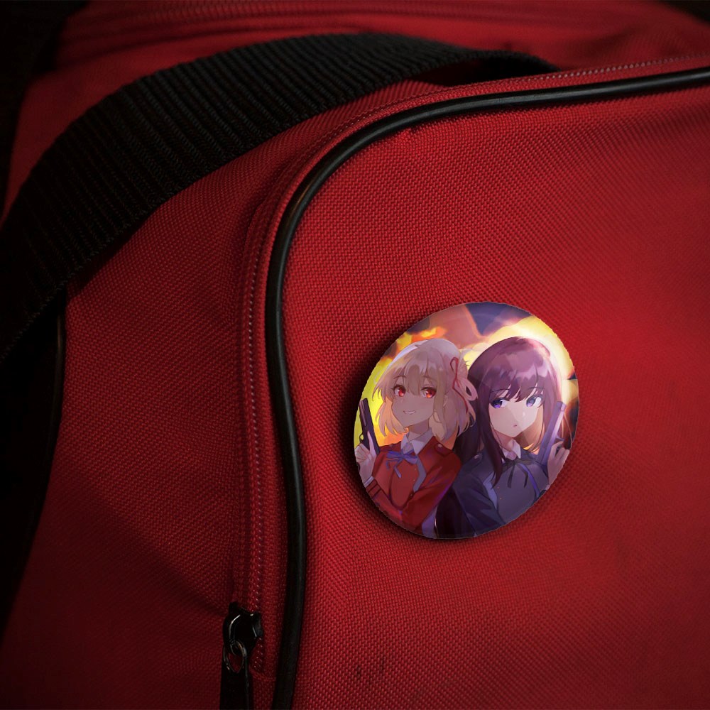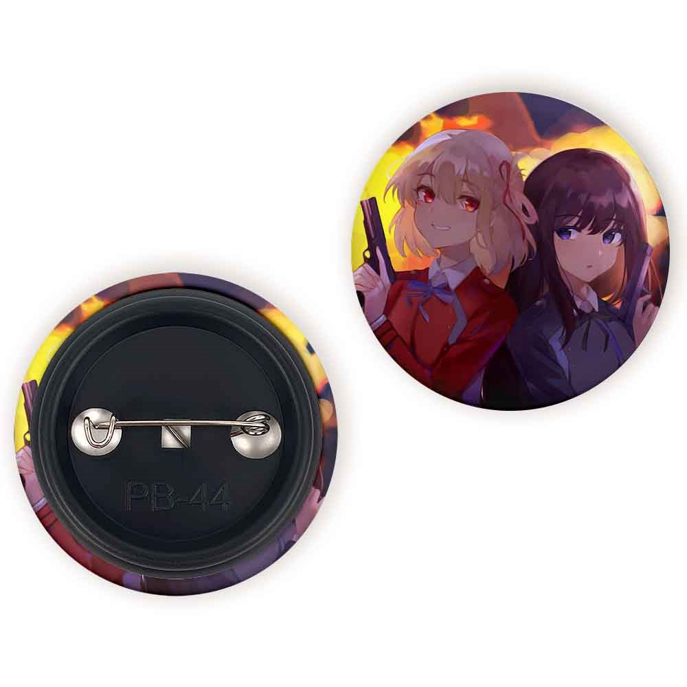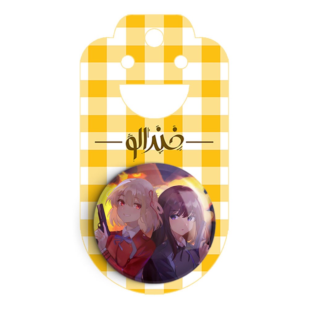 پیکسل 44 میلی متری تاکینا و چیساتو انیمه لیکوریس ریکویل Lycoris Recoil خندالو با روکش سلفون حرارتی مات مخملی ضدخش و قطعه پشتی رنگی تولید شده است.پلاستیکی پشت پیکسل با سوزن یک تکه ثابت و بدون لغزش و جا به جایی، ایستایی بسیار بهتری نسبت به پشتی فلزی پیکسل دارند که این مهم در تولید این محصول نیز رعایت شده است.