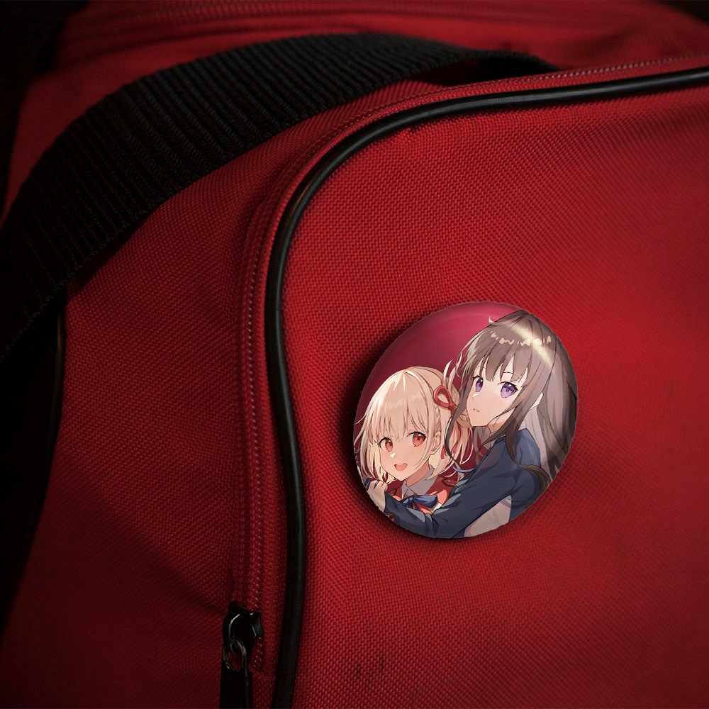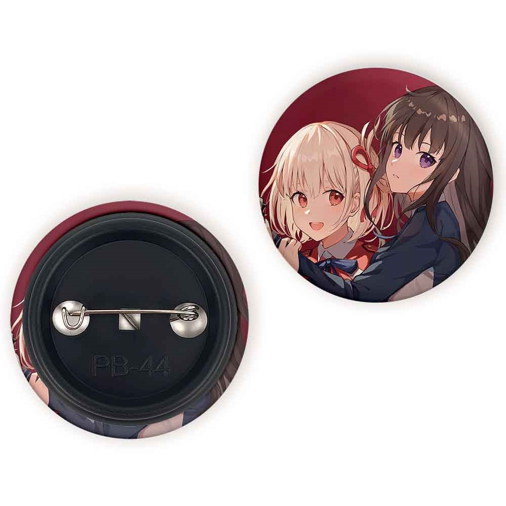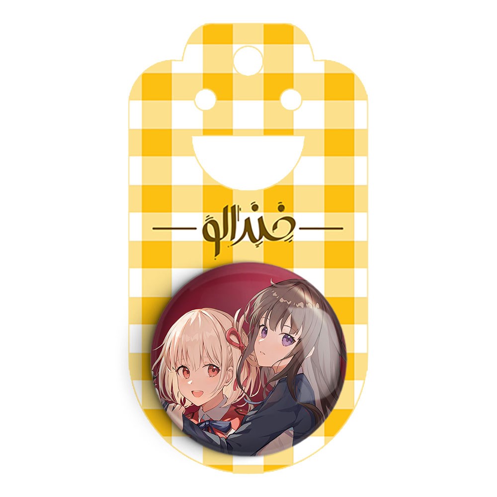 پیکسل 44 میلی متری تاکینا و چیساتو انیمه لیکوریس ریکویل Lycoris Recoil خندالو با روکش سلفون حرارتی مات مخملی ضدخش و قطعه پشتی رنگی تولید شده است.پلاستیکی پشت پیکسل با سوزن یک تکه ثابت و بدون لغزش و جا به جایی، ایستایی بسیار بهتری نسبت به پشتی فلزی پیکسل دارند که این مهم در تولید این محصول نیز رعایت شده است.